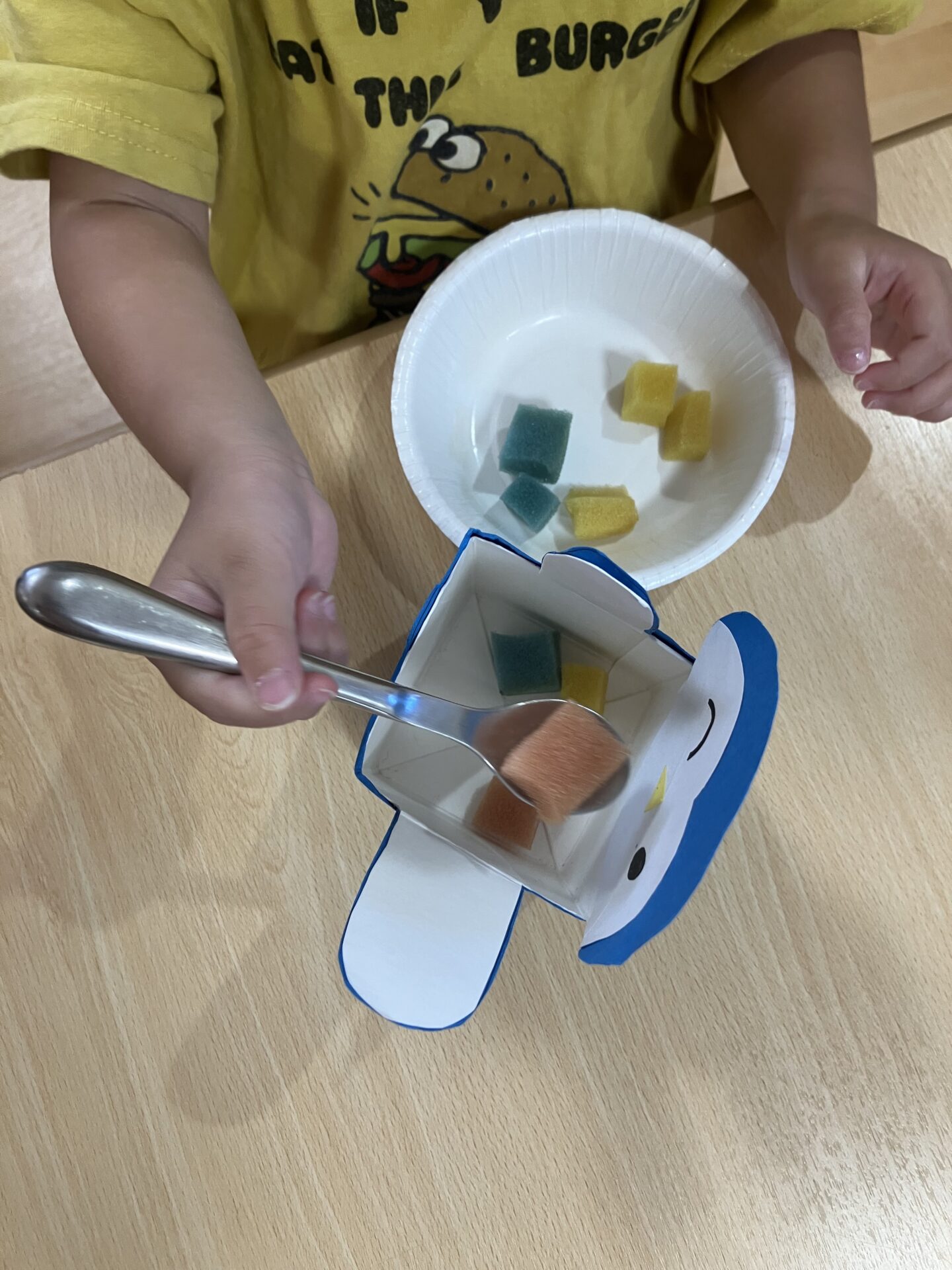 指を動かす練習の後はスプーンを三点持ちで持ってみて、