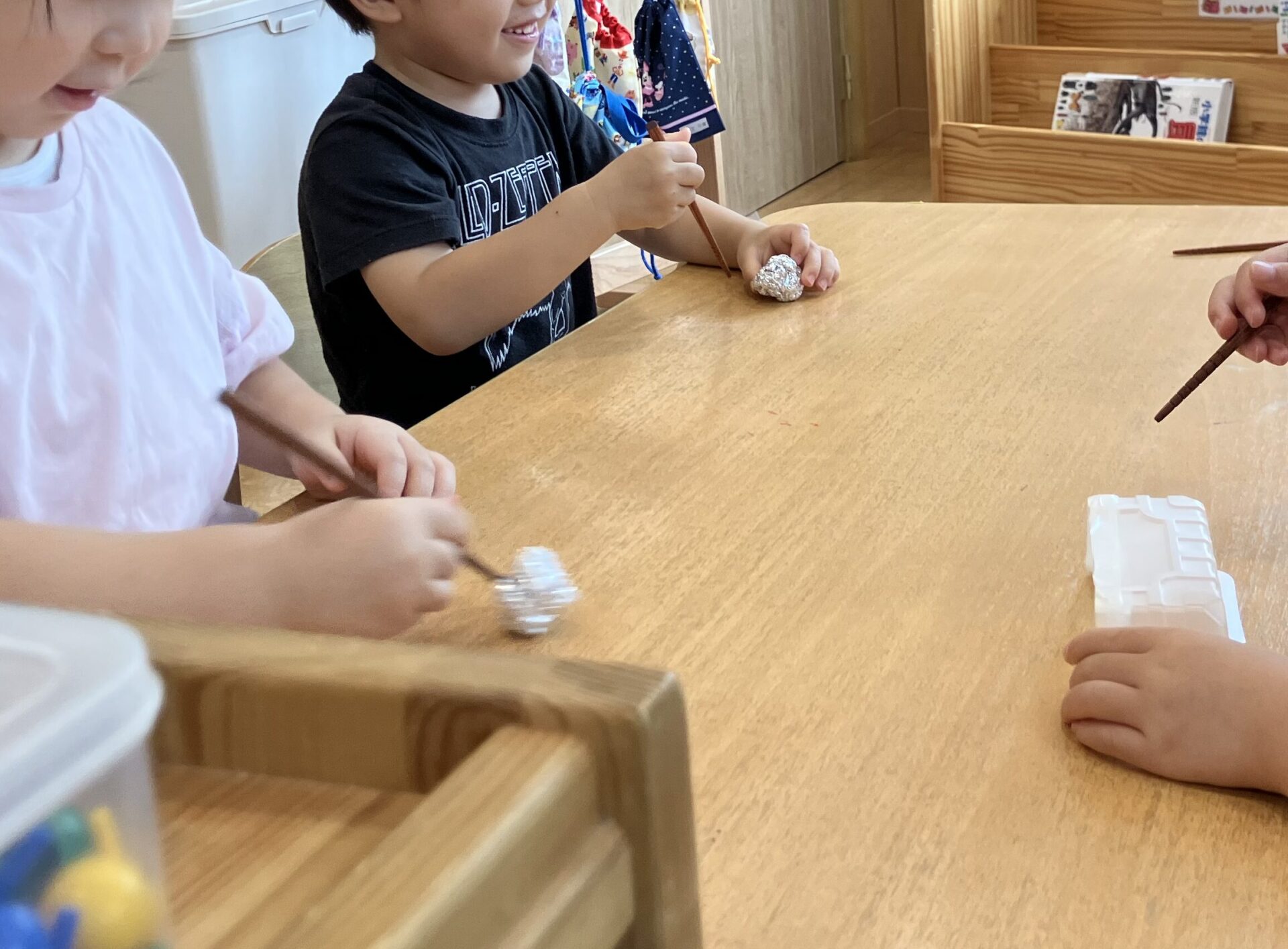 食育当日に家庭でお箸使っているか聞いてみたところ、ほとんどの子が使ったことがあるとのことで早速練習開始!