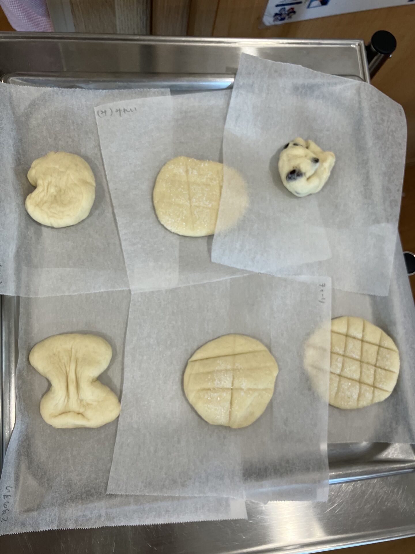 生地は同じでも焼いてからジャムを付けて食べたり、メロンパンのようにグラニュー糖をまぶして線をつけたり、レーズンを入れたりすることで自分だけのオリジナルのパンが完成しました☆