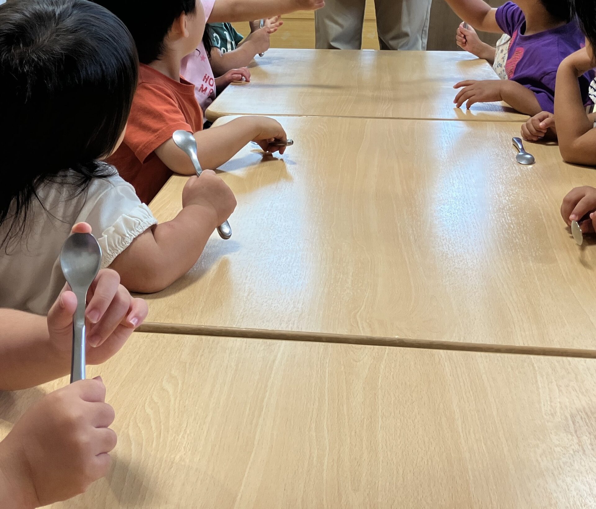 おやつの時間の前にスプーンを使って、持ち方の練習をしました。「見て!上手に持てるよ!」上手持ちの子もいれば、下手持ちの子もいました。みんな上手に手をグーにして、しっかりと握っていました。