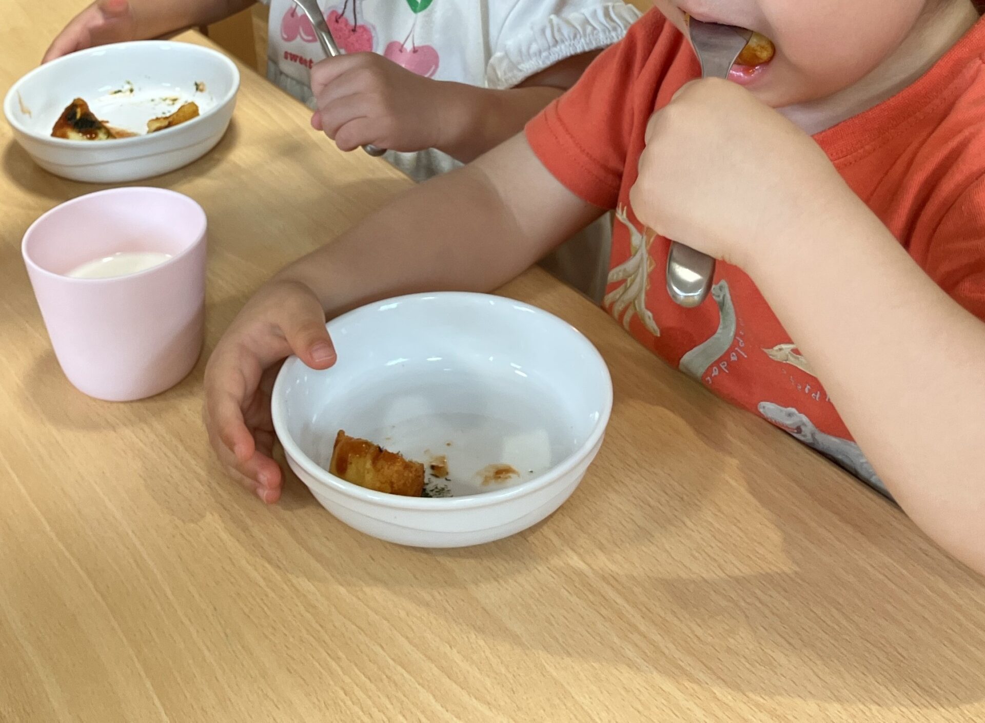 みんなで一緒に手を合わせて「いただきます!」一斉にフォークを手に持ち、食べはじめました。