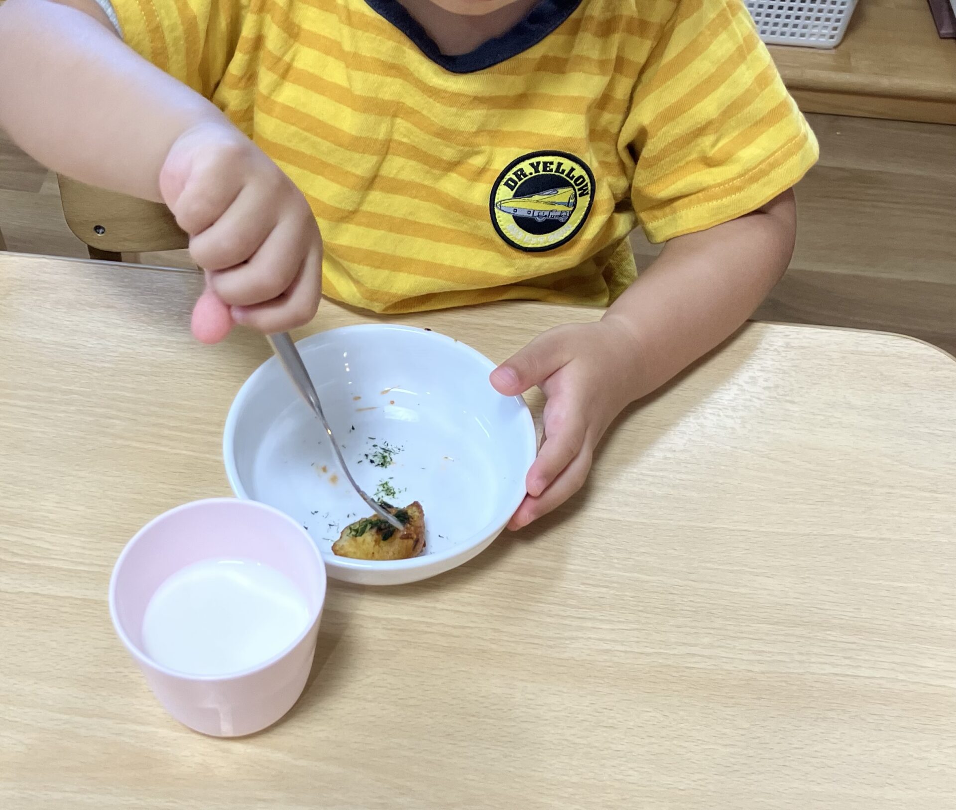 フォークを持っていない反対の手はお皿に添えていて、食事のマナーもばっちりなうさぎ組さんでした。