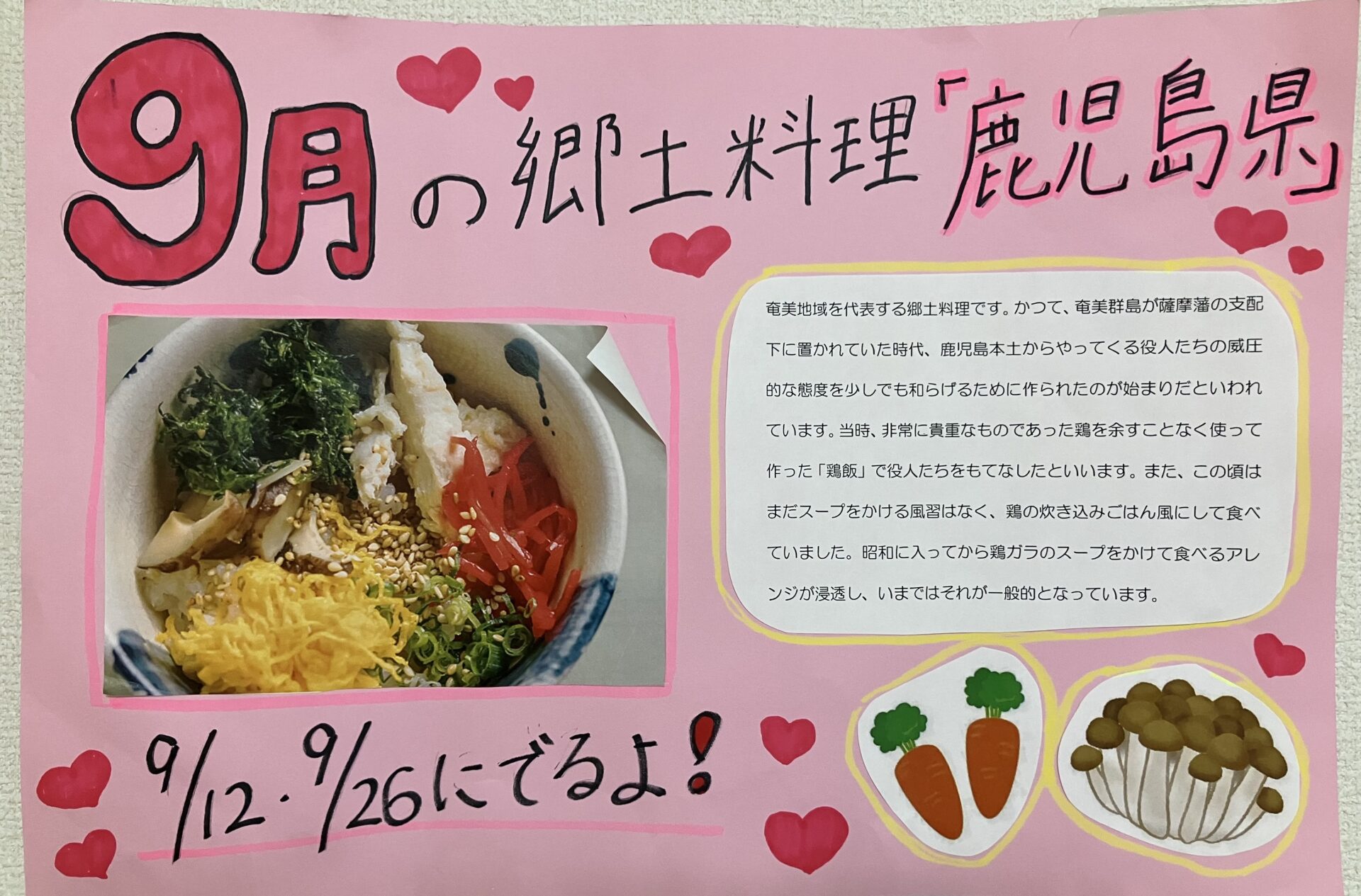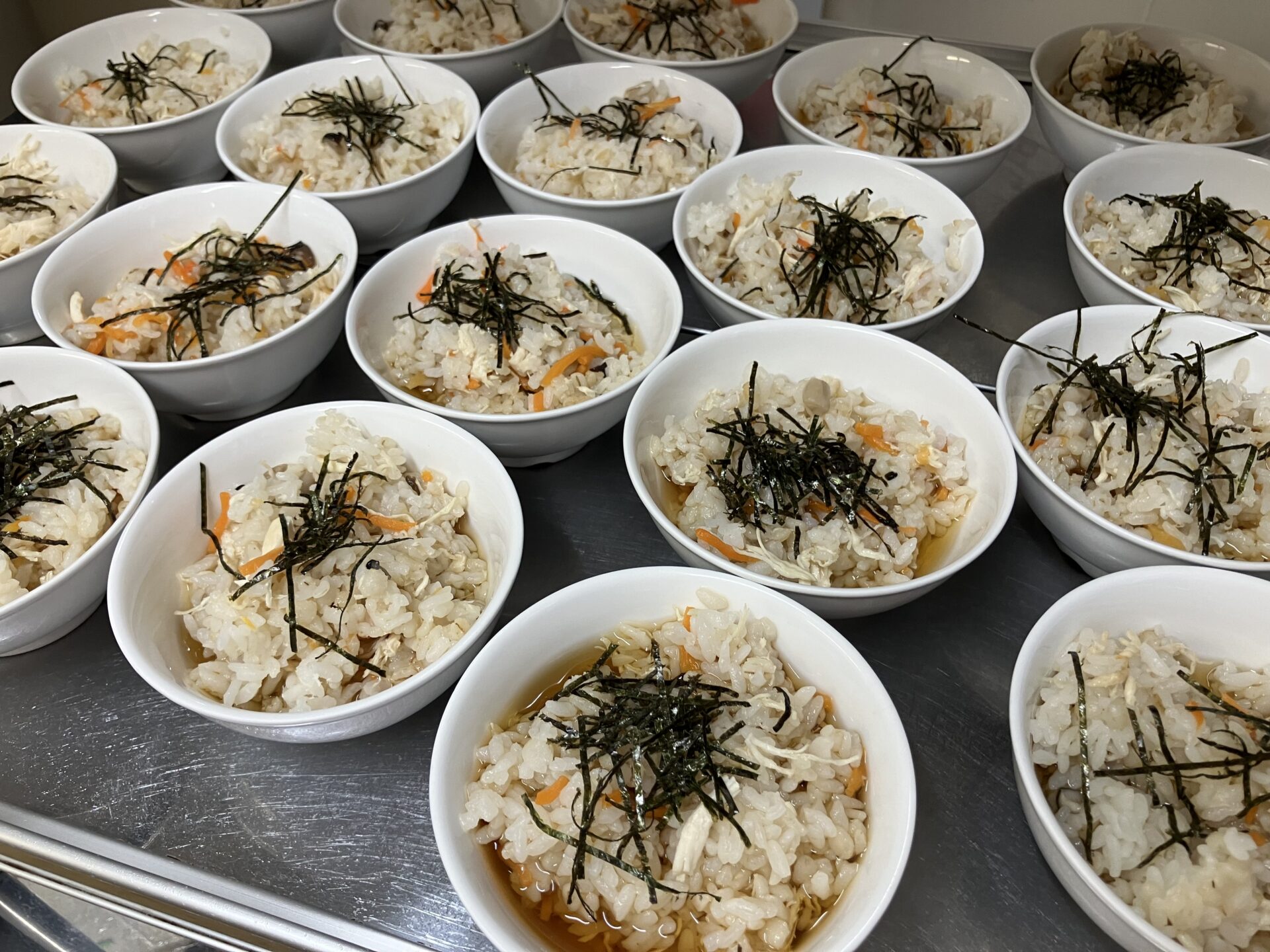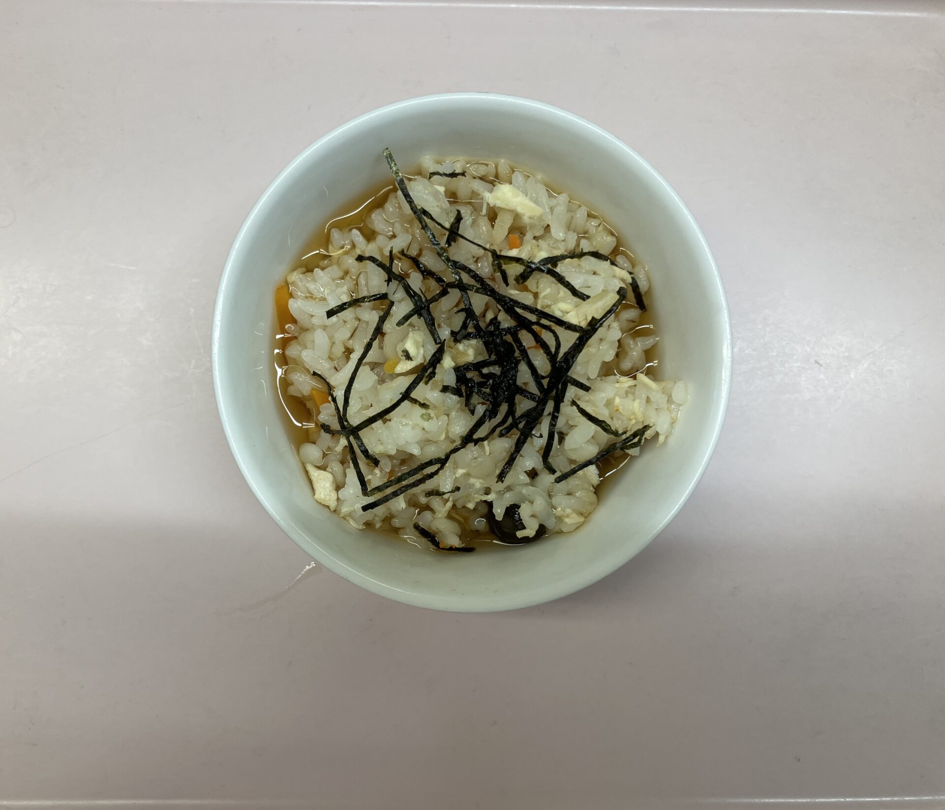 「鹿児島県」より、「鶏飯」がでました!生姜のきいただしをご飯にかけたものです。トッピングのきざみのりが良いアクセントになっています。