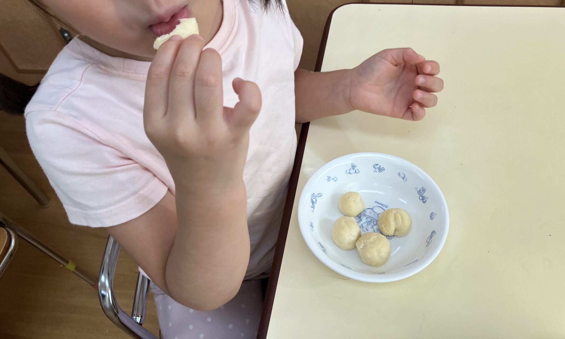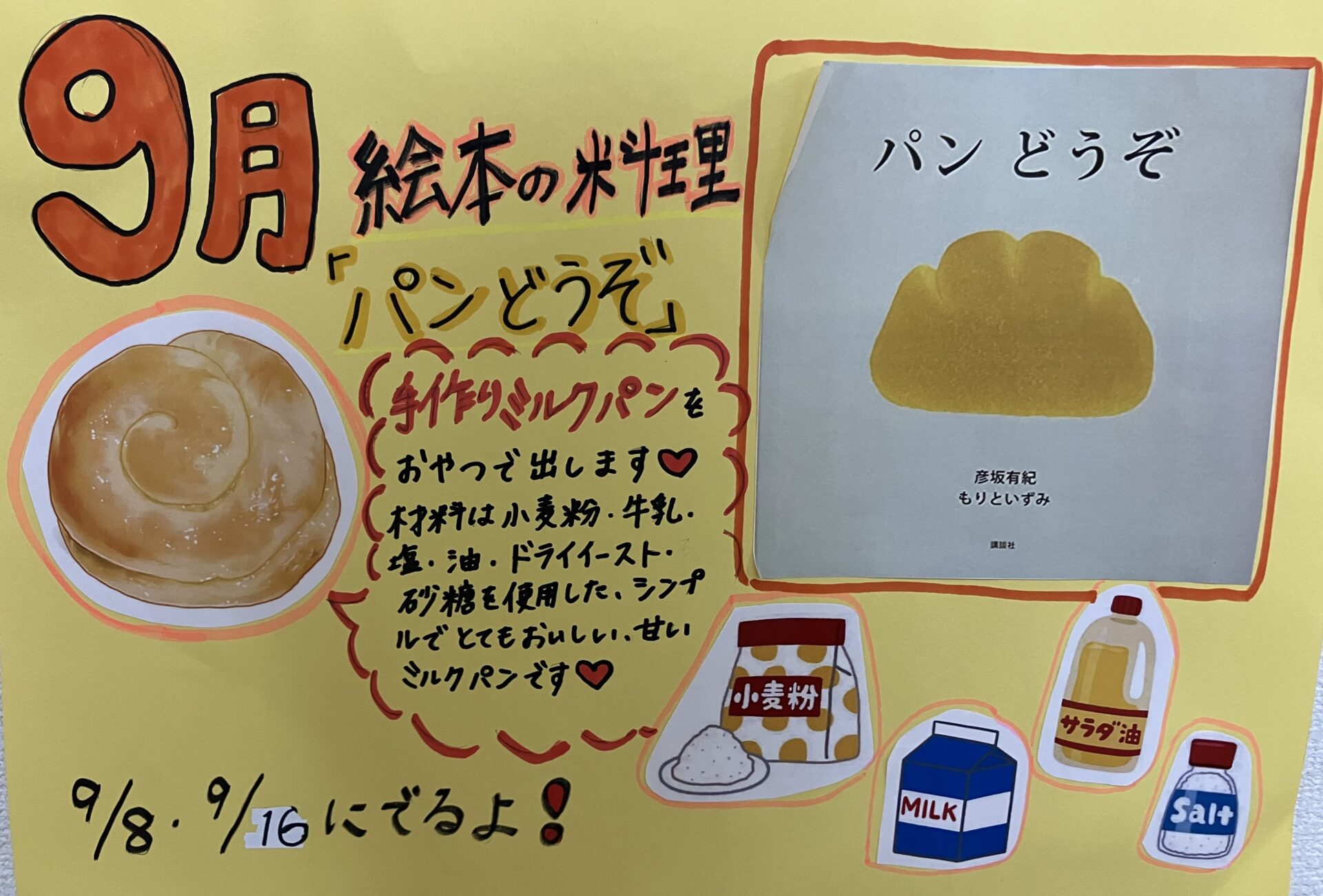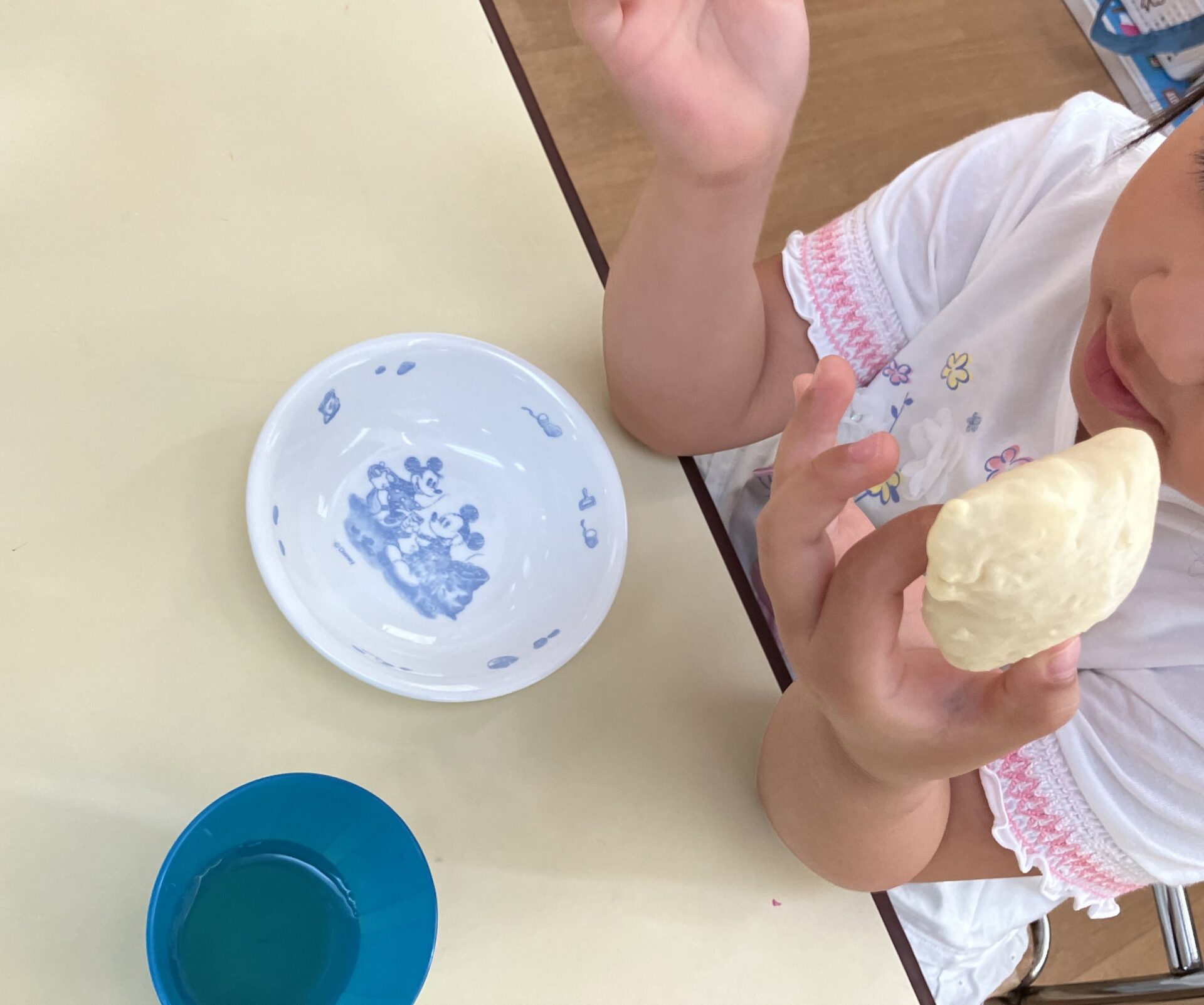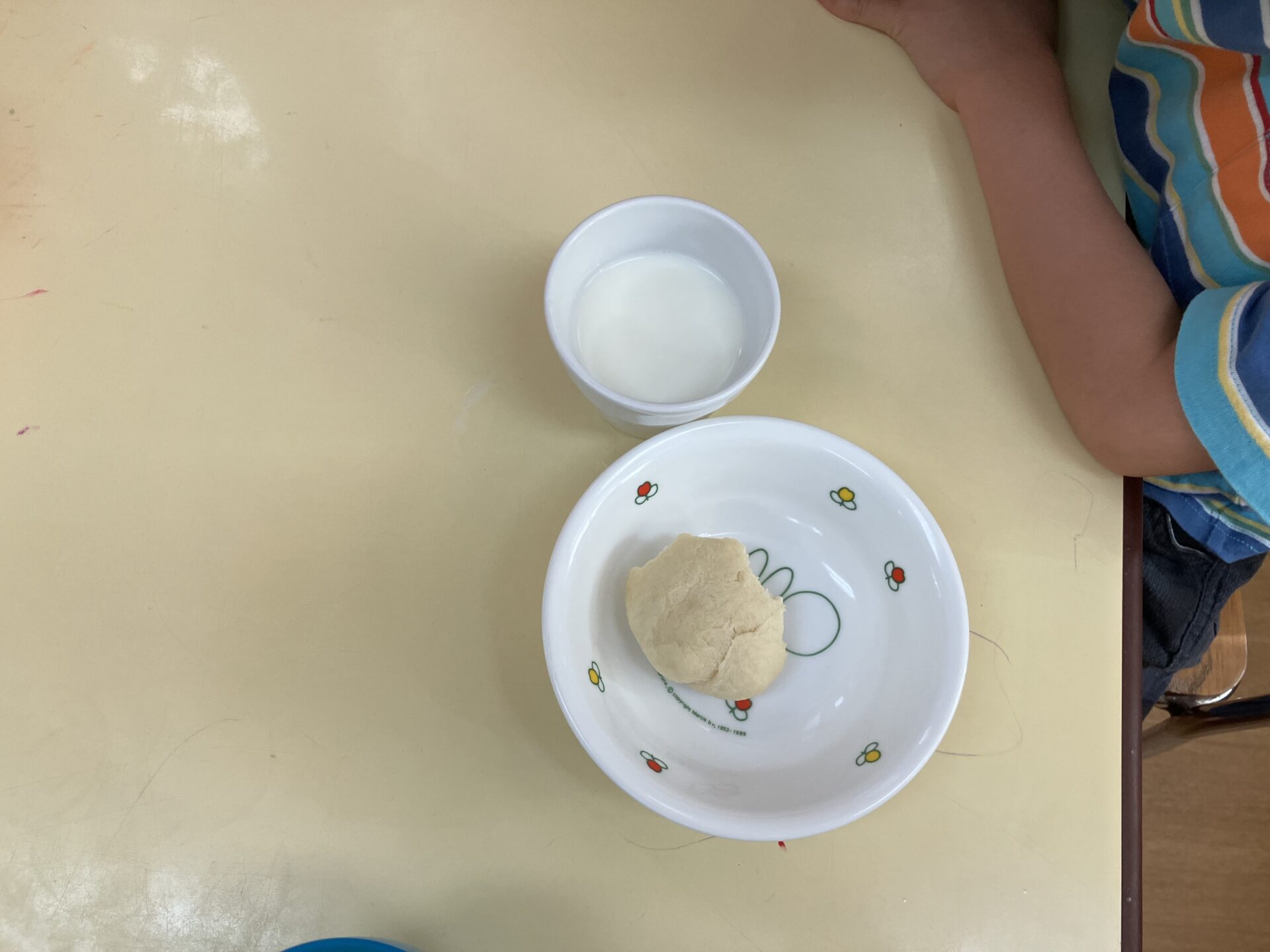「パンどうぞ」より、「ミルクパン」が出ました。水の代わりに牛乳を使用したパンで、生地から手作りのほんのり甘いパンです。4歳児では食育を行ったりと、とっても人気でした♪