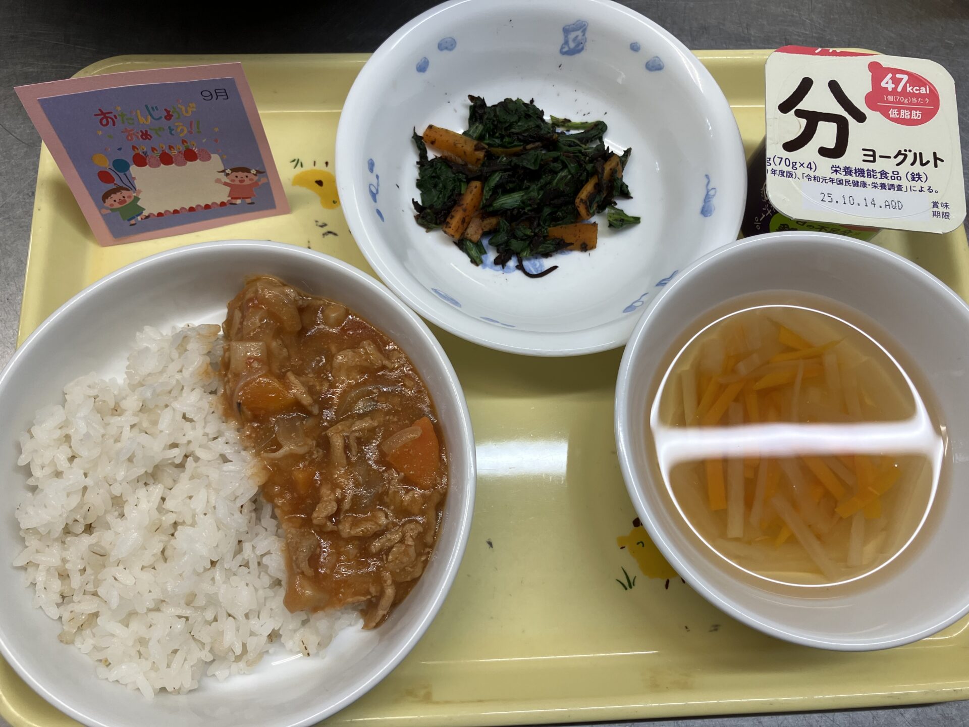 ハヤシライス、野菜スープ、ほうれん草のゆかり和え、ヨーグルト