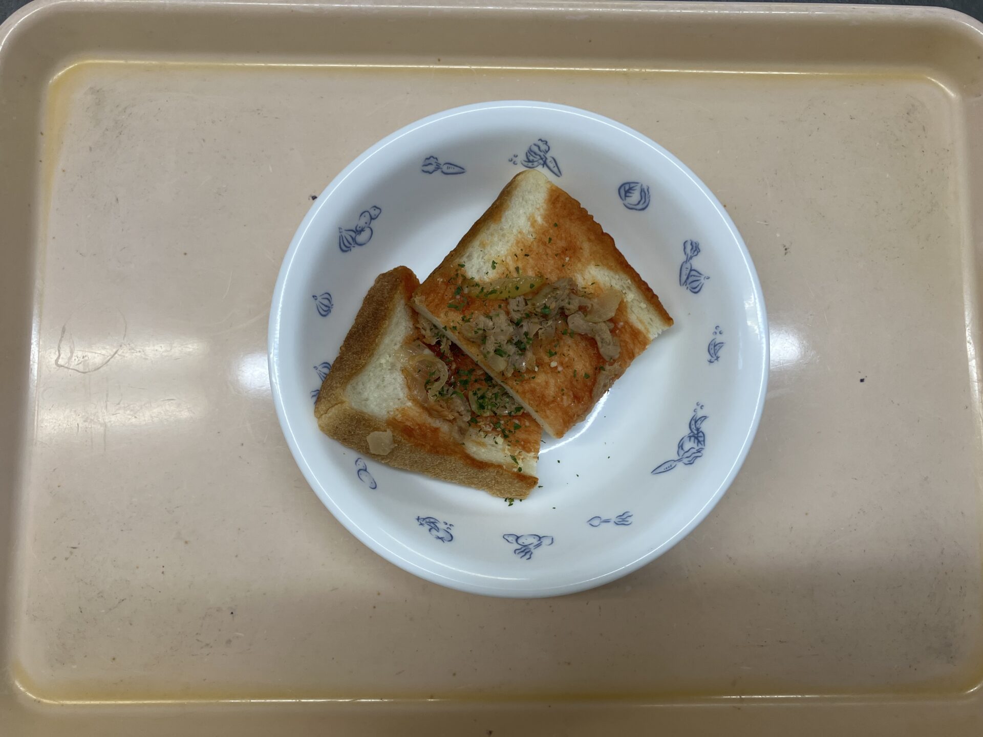 お昼のハヤシライスや、おやつのピザトーストは特に大人気でした!おいしい!といった声が多く、みんなたくさん食べてくれました♪ピザトーストはケチャップをぬった食パンに玉ねぎとツナをのせ、パセリと粉チーズをトッピングしています♡食欲をそそるいいにおいでした♪