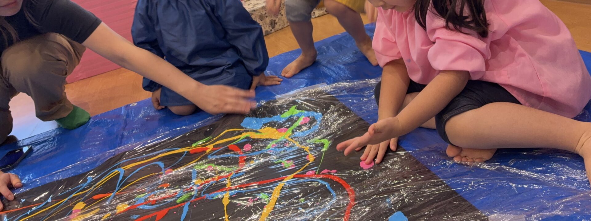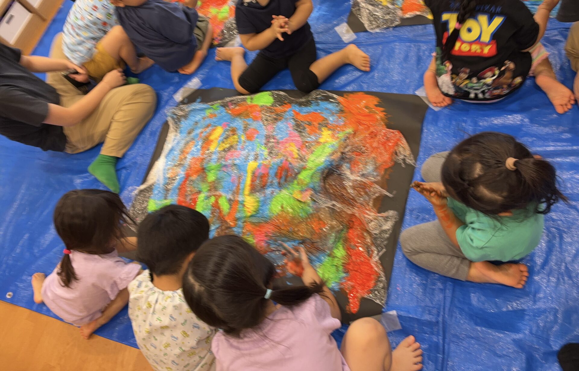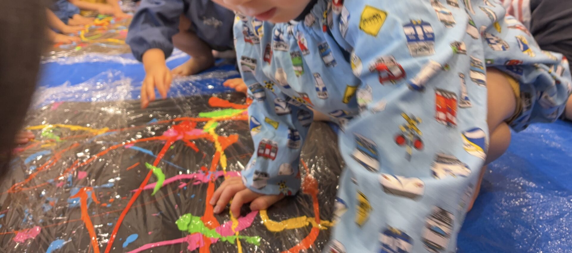 さて、うさぎ組とぱんだ組では「宇宙製作」を行いました。模造紙の上に絵の具をを垂らして、その上にラップを敷いて手で伸ばすと、色と色が混ざり合って新しい模様に★