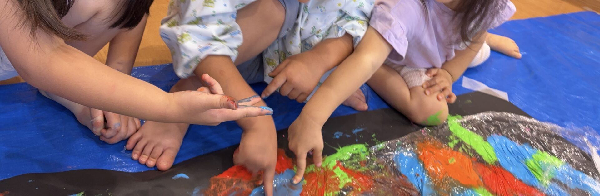 絵の具が手っと見せ合いっこをして、笑顔いっぱいの子どもたちでした★