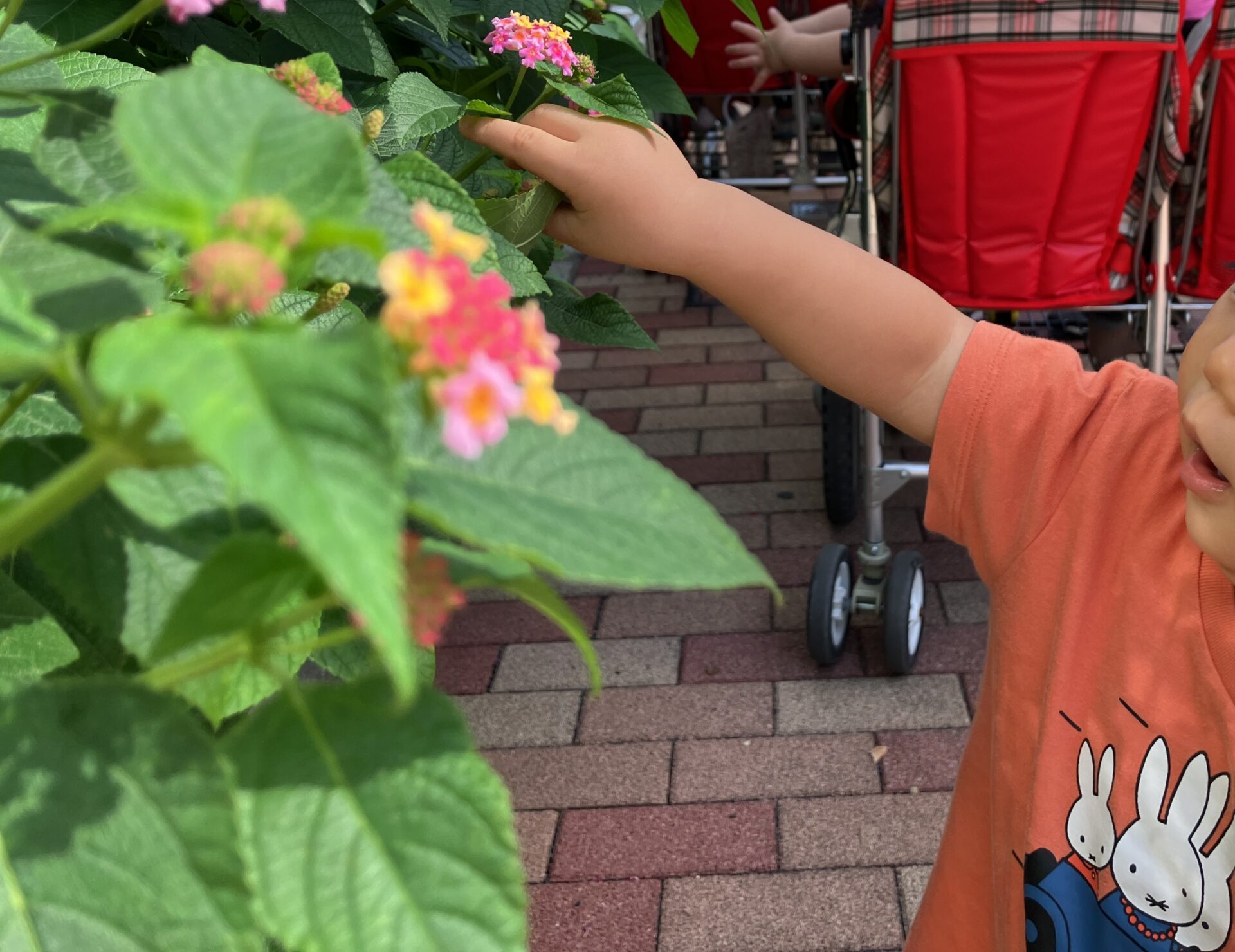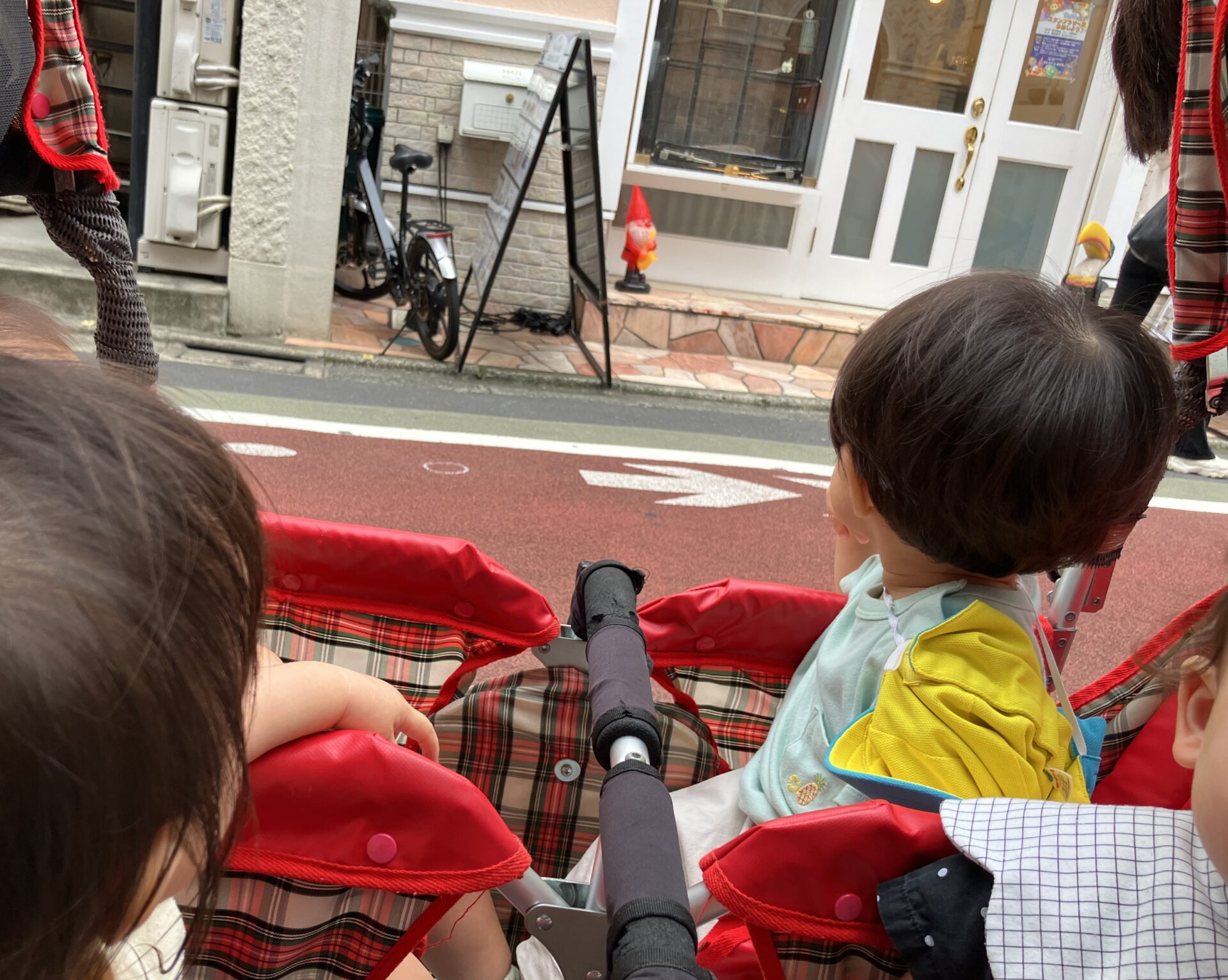外は刺激いっぱいで、気になったもの、気が付いたものがあると「あ!あ!」と声を出したり、指さしで教えてくれたりなど、とっても楽しそうな子ども達です。