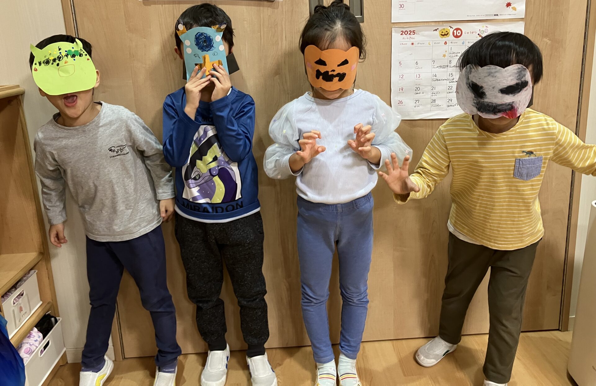 以前から各クラスで、ハロウィンに向けてお面やカバンを製作していましたよ♪