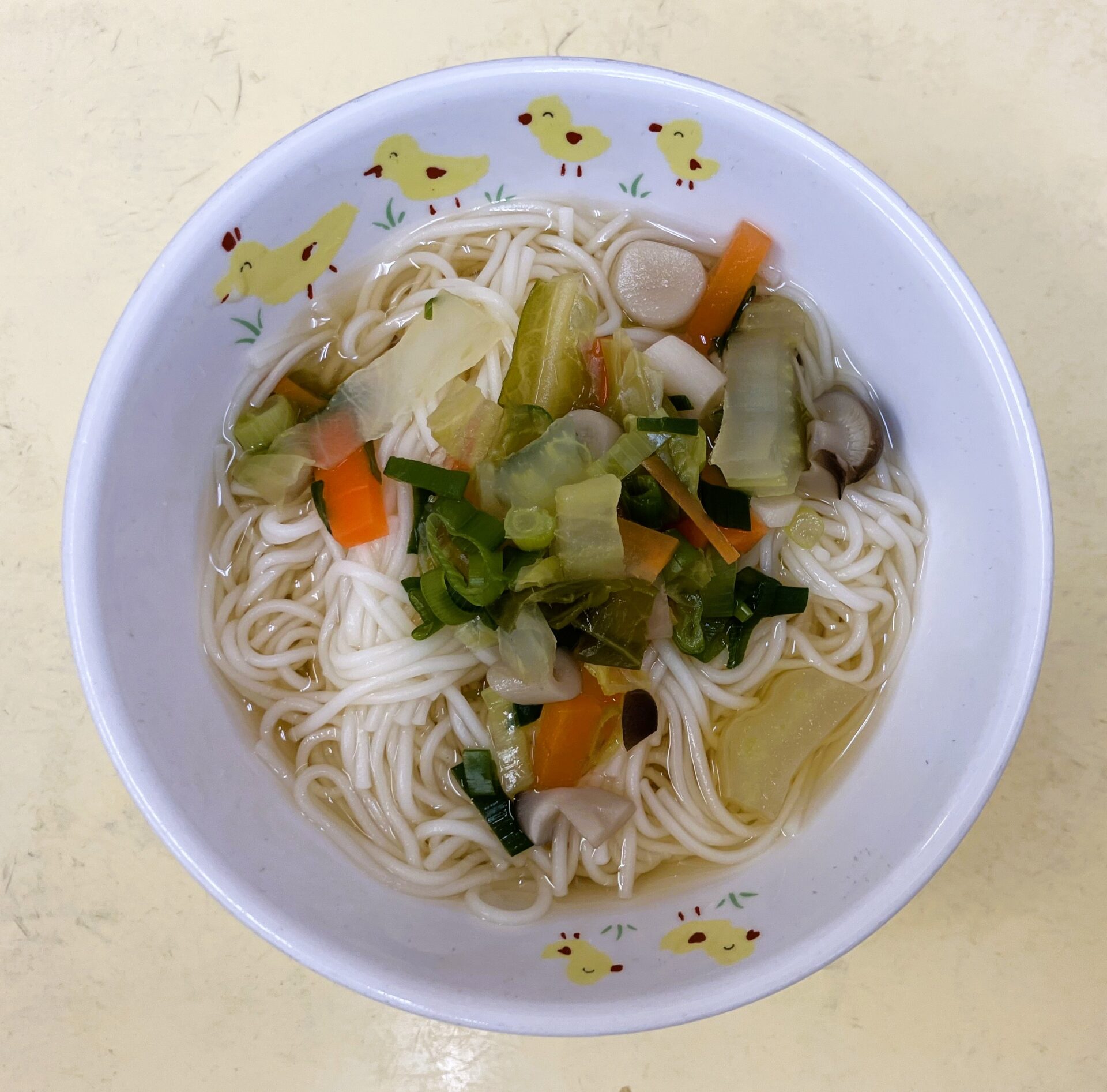 岡山県南西部の浅口市は、恵まれた気候と良質な材料を入手できることから江戸時代より手延べ素麺の産地として栄えました。手延べ素麺の製造過程で麺の端の部分が少し広がり、形が三味線のばちに似ていることから「ばち」と呼ばれ、細い素麺とは違ったモチモチとした食感が特徴です。保育園では通常の素麺を用いて提供しました。