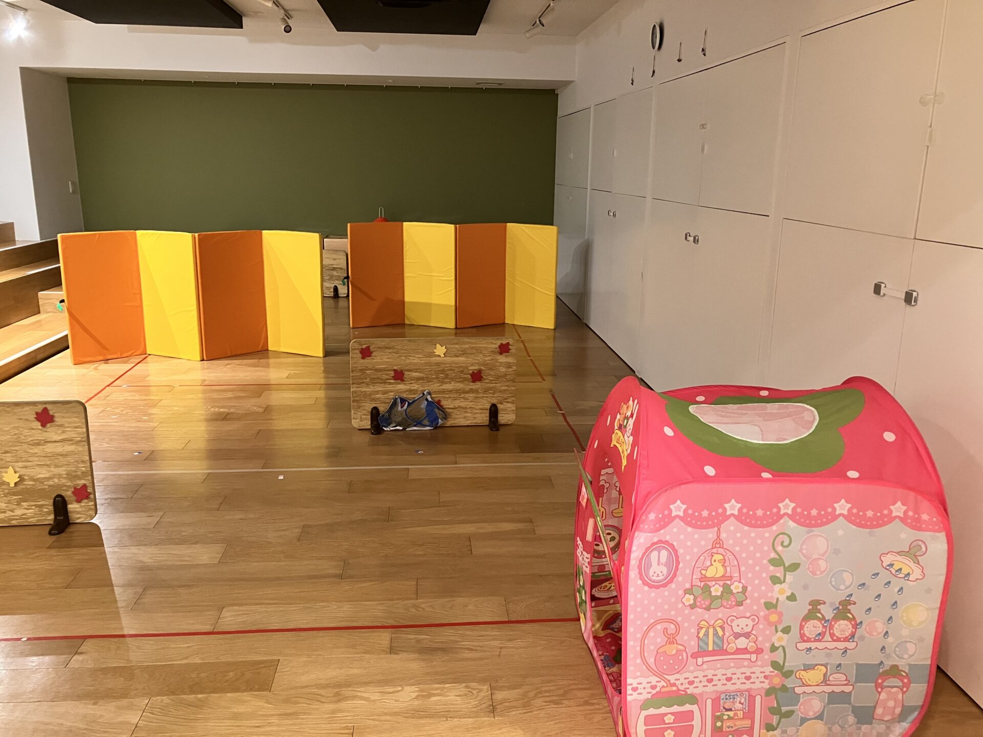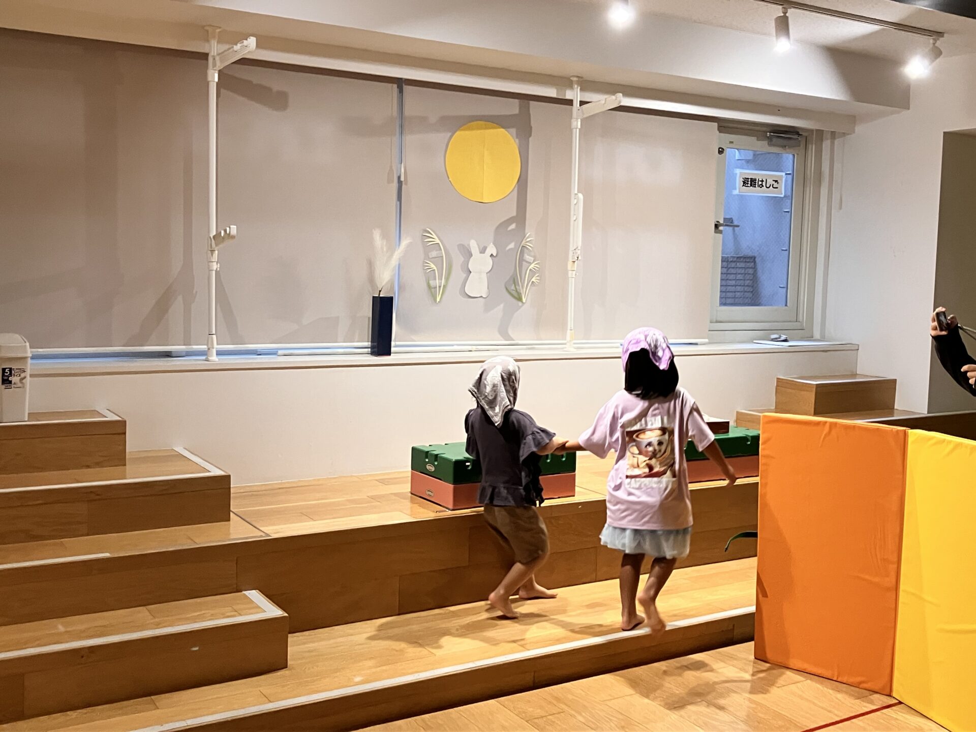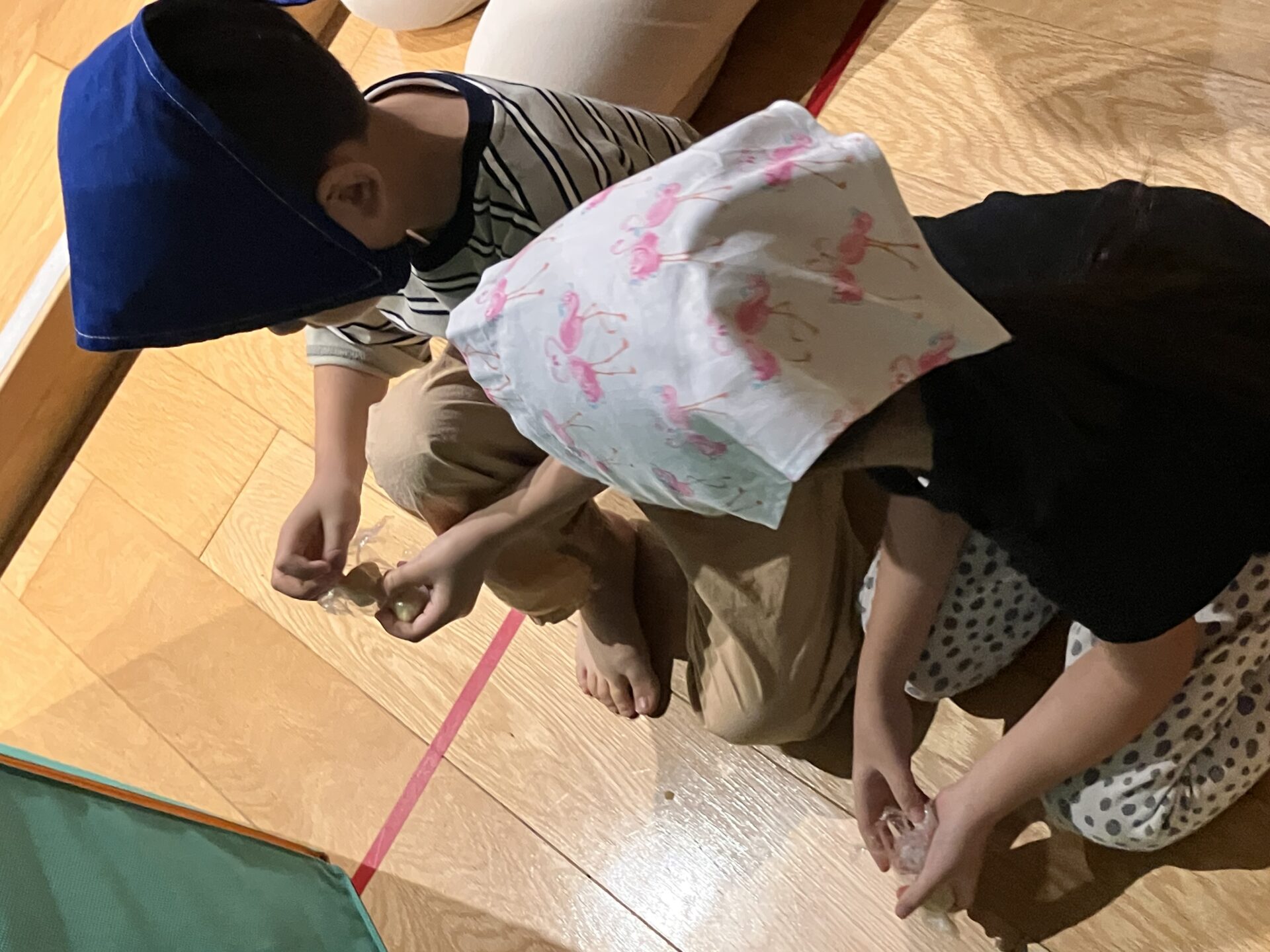 3歳児クラスの子どもたちも障害物に隠れながらこっそりとお団子を取っていましたよ。