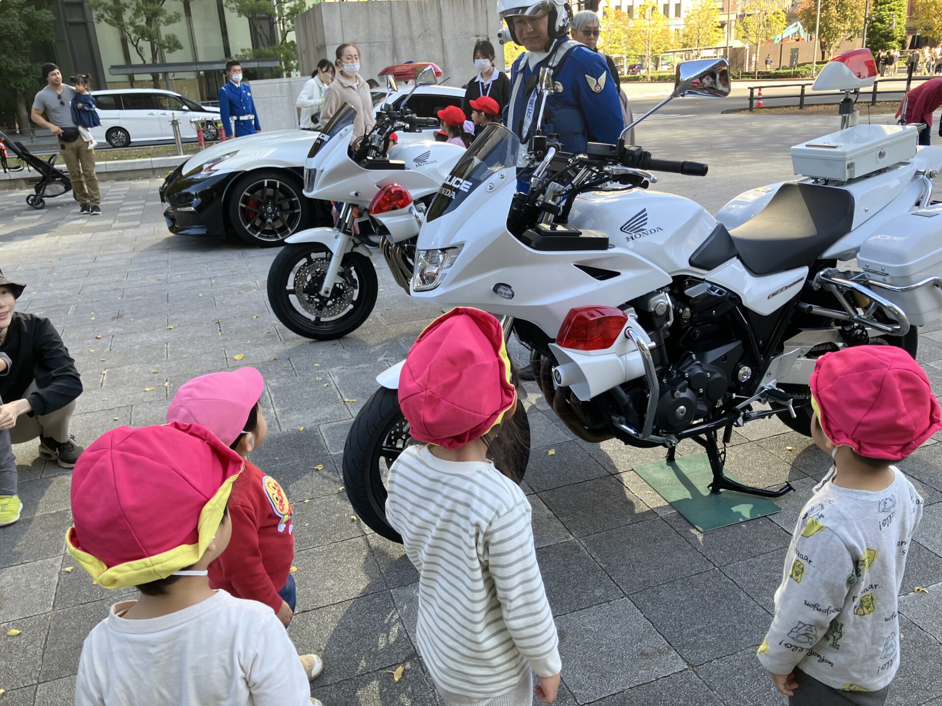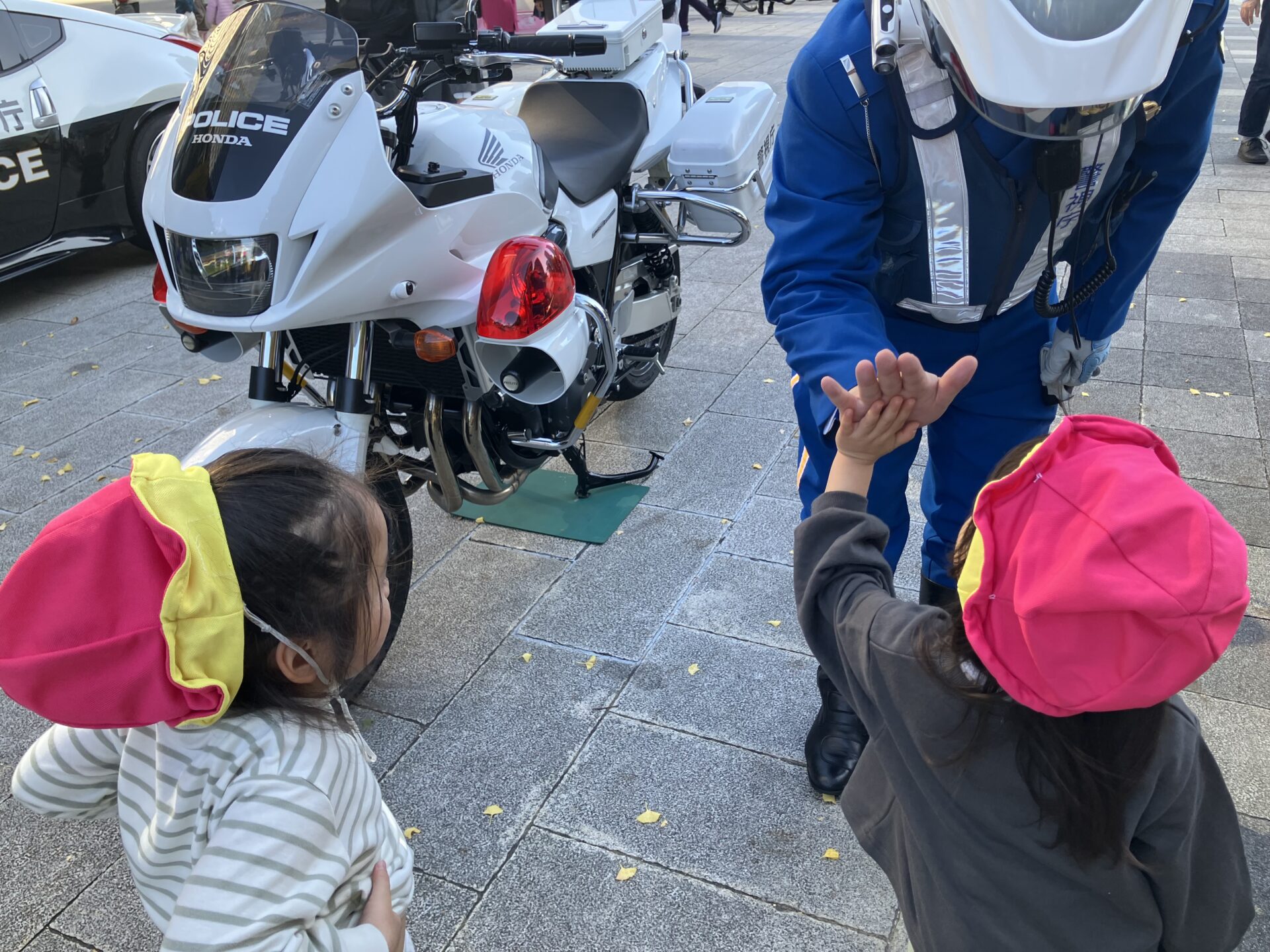 いつも絵本の中にある『パトカー』や『白バイ』を実際に目の前で見ることができて、呆然と立ち尽くす様子もありました。そうですよね、先生たちもパトカーに乗ったことないし、こんなに近くで見たこともないですから!