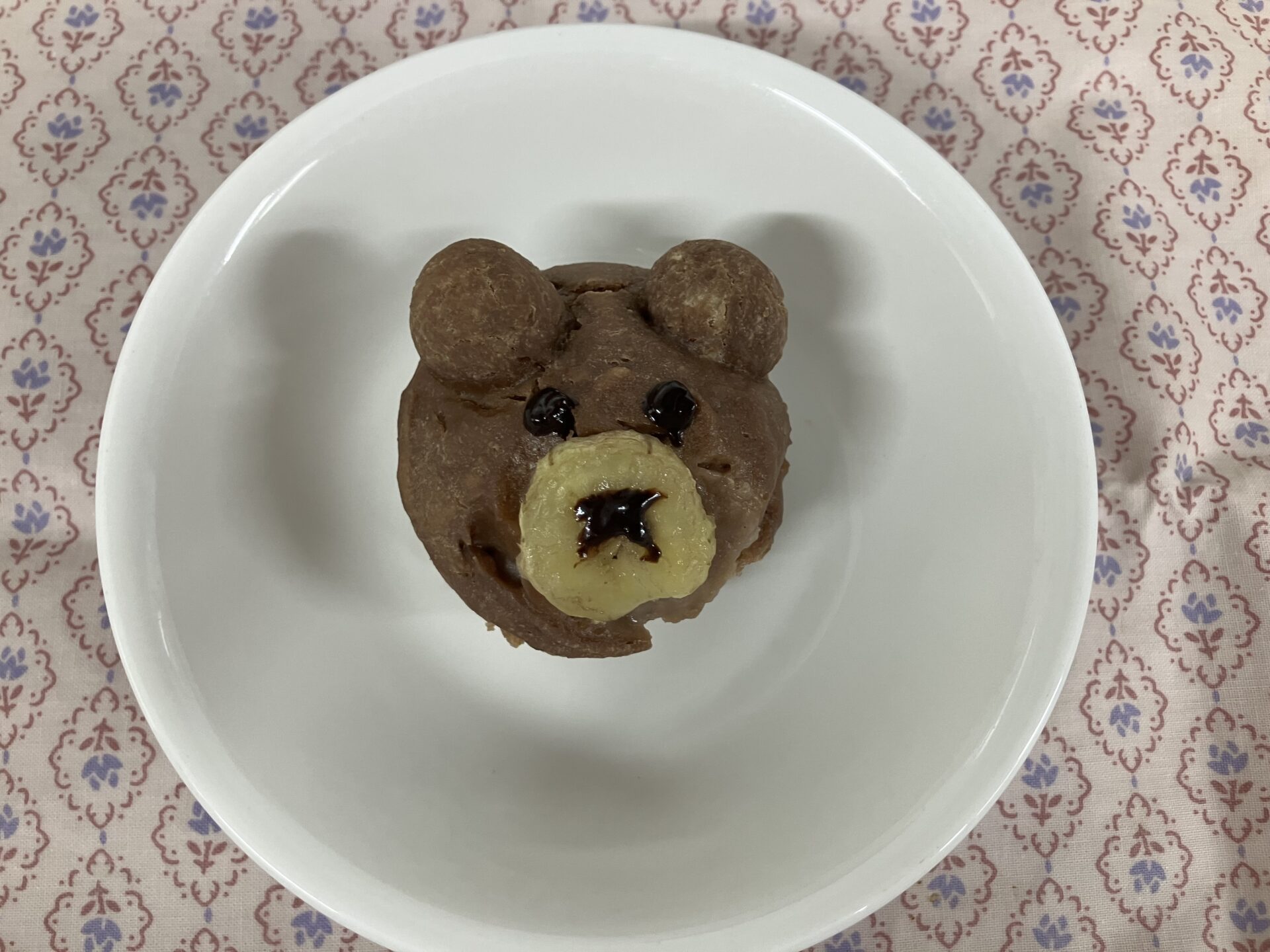 ココア生地で作ったくま型のマフィンに輪切りのバナナを口元に見立て、最後にココアペンで目と口を描きました!