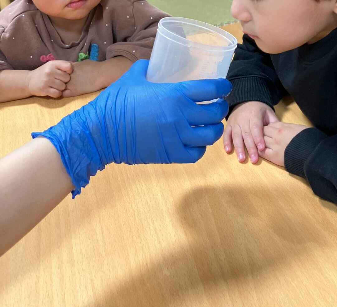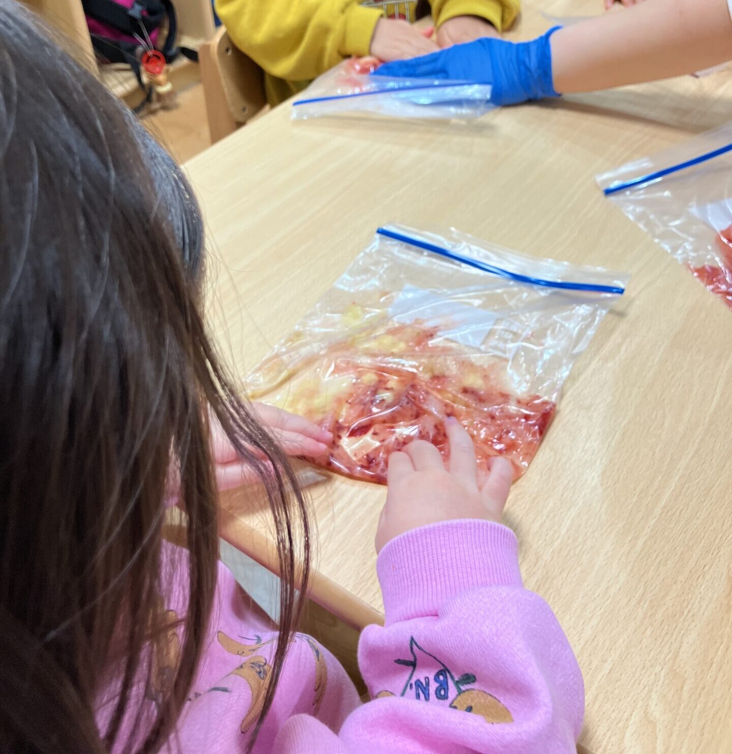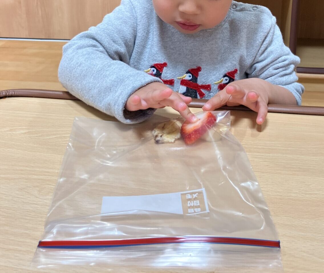 ばななといちごをジップロックに入れ、みんなで潰してもらい牛乳と合わせてミックスジュースの出来上がり🍓🍌