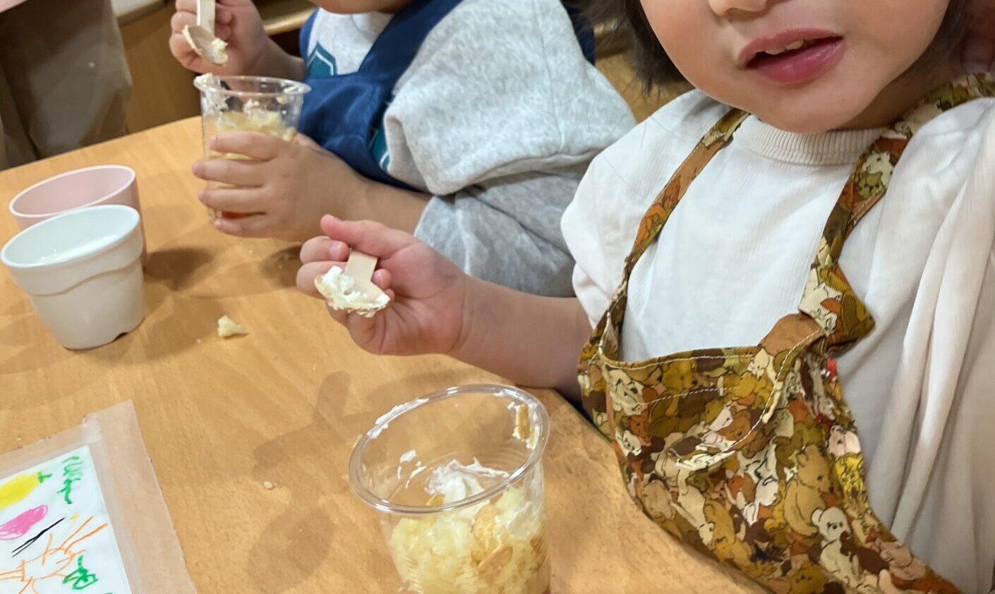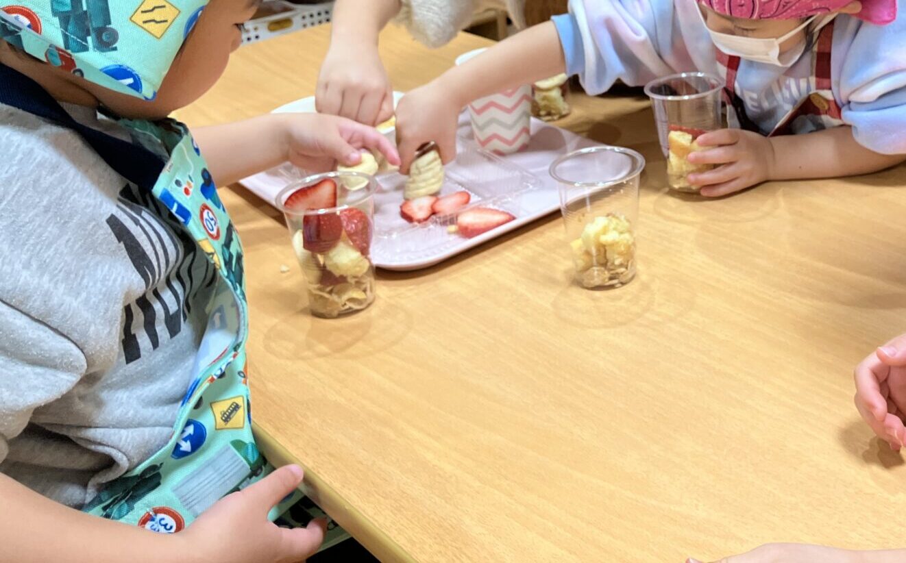 3・4・5歳児クラスでは季節のフルーツを使ってパフェ作りに挑戦!
