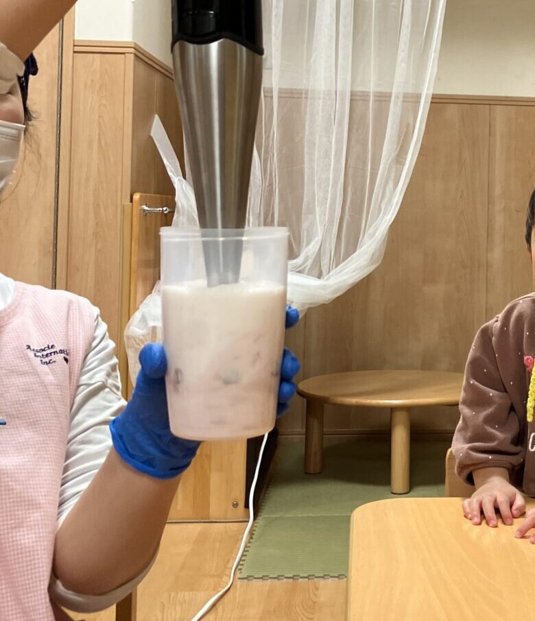 0・1・2歳児クラスでは、バナナといちごを使ってフルーツジュース作りをしました♪