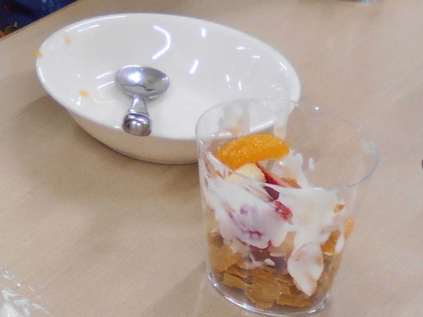 「コーンフレークはスプーン10杯だよ」「ヨーグルトクリームはスプーン山盛り2杯だよ」