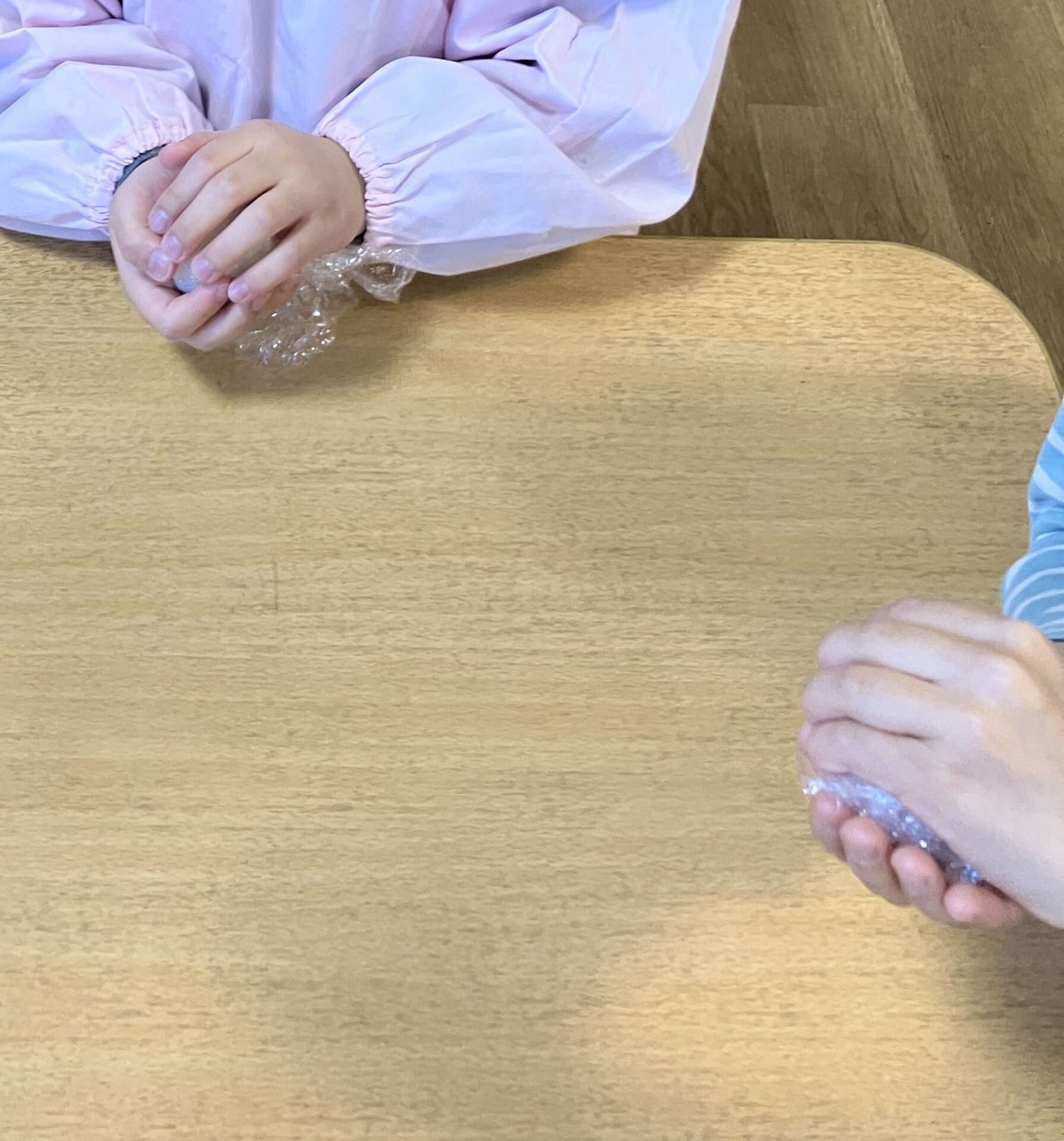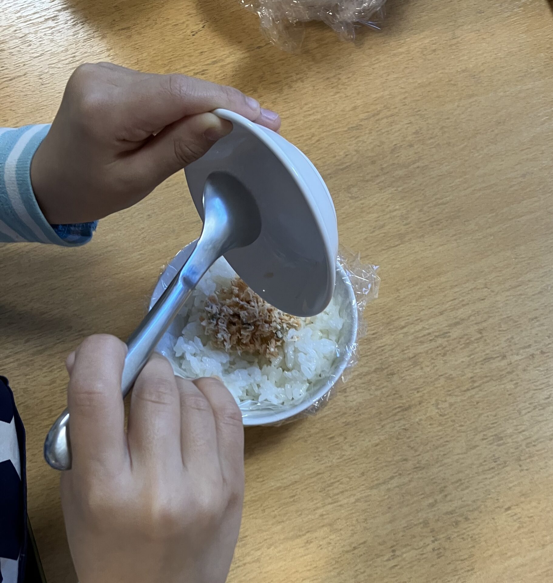 お茶碗に盛られているごはんのくぼみに鮭をスプーンで入れて、ラップで包んで握ります。「どんなかたちに握ろうかな?」見て!大きなまんまるおにぎり!」「三角にしたい!」先生に三角の握り方を聞いて頑張って握ろうとする子もいて、みんな楽しそうに握っていました。