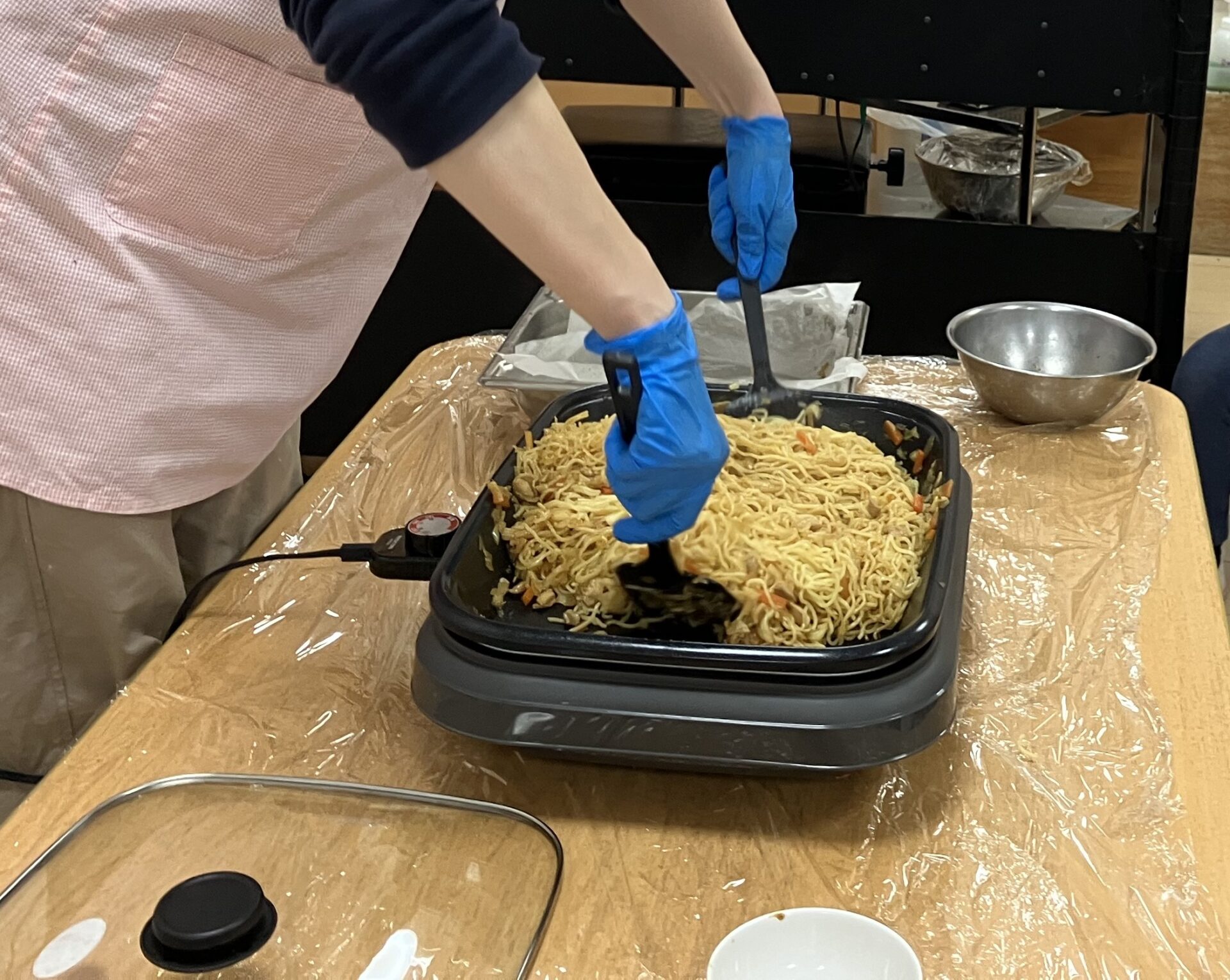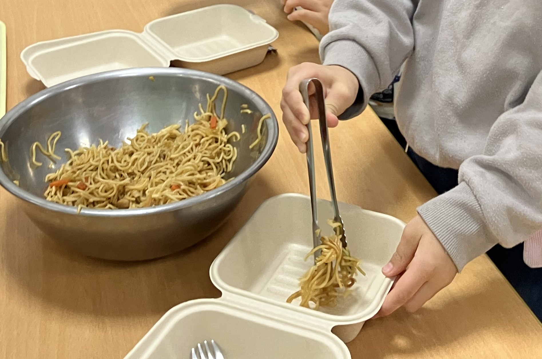 いつもは給食室で盛り付けをしていますが、今回2~5歳児クラスはホットプレートで作った焼きそばを子どもたちの前で盛り付けてみました。大きな調理道具に興味津々で「それおもちゃで使ったことあるよー」と教えてくれたり、フライ返しの名前が思い出せず、使う様子をジェスチャーしながら「こうするやつ!」と教えてくれたり、自分の経験や知っている言葉を使って伝えてくれた子どもたち。調理中の様子は写真などで説明したことはありますが、実際の様子を見てもらうよい機会となりました。