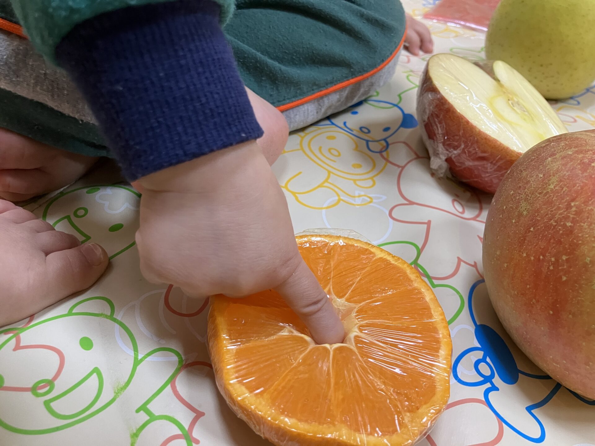 野菜より果物の方が食べる物として結びつきやすいのか、ツンツンしてみたり、ぎゅーっとしてみたりといつもより積極的に手を伸ばしていた子どもたち。大きなお口をあーんと開けて食べたそうにしている姿がとても可愛かったです。