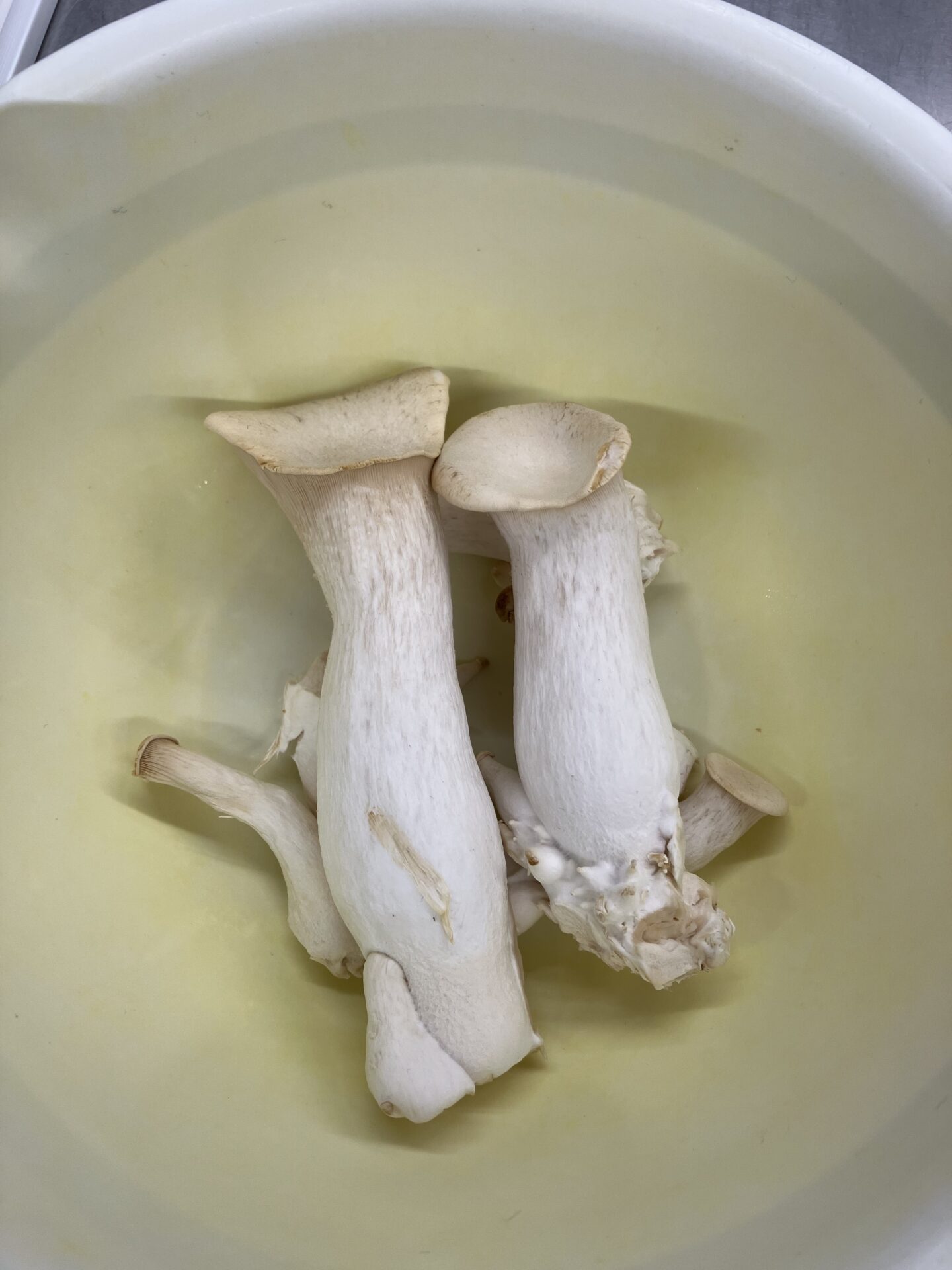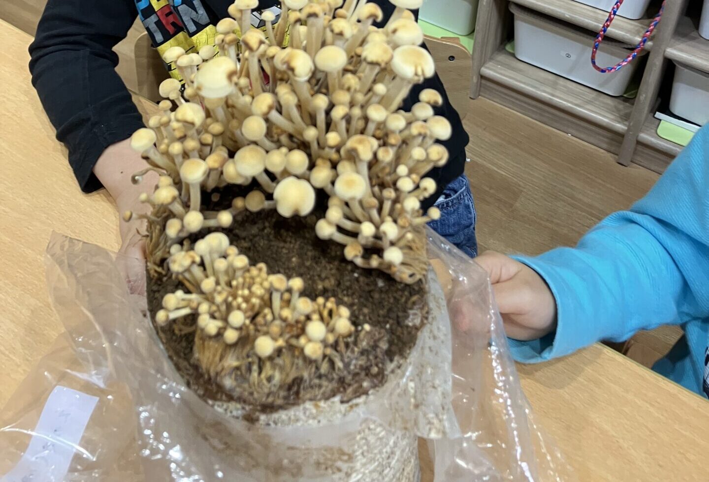 1ヶ月ほどできりん組では大きなエリンギ、らいおん組ではたくさんのえのきたけが育ちました。