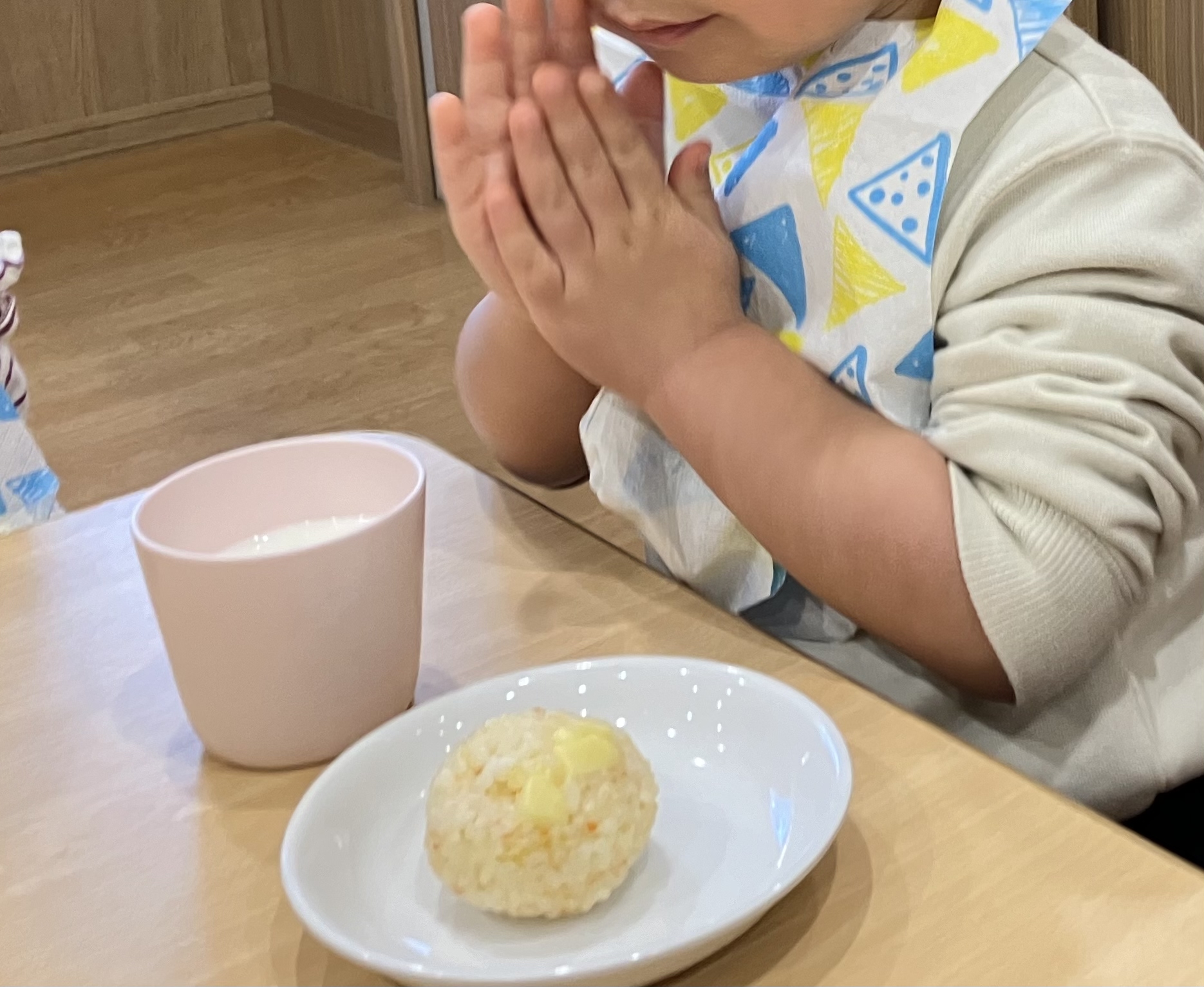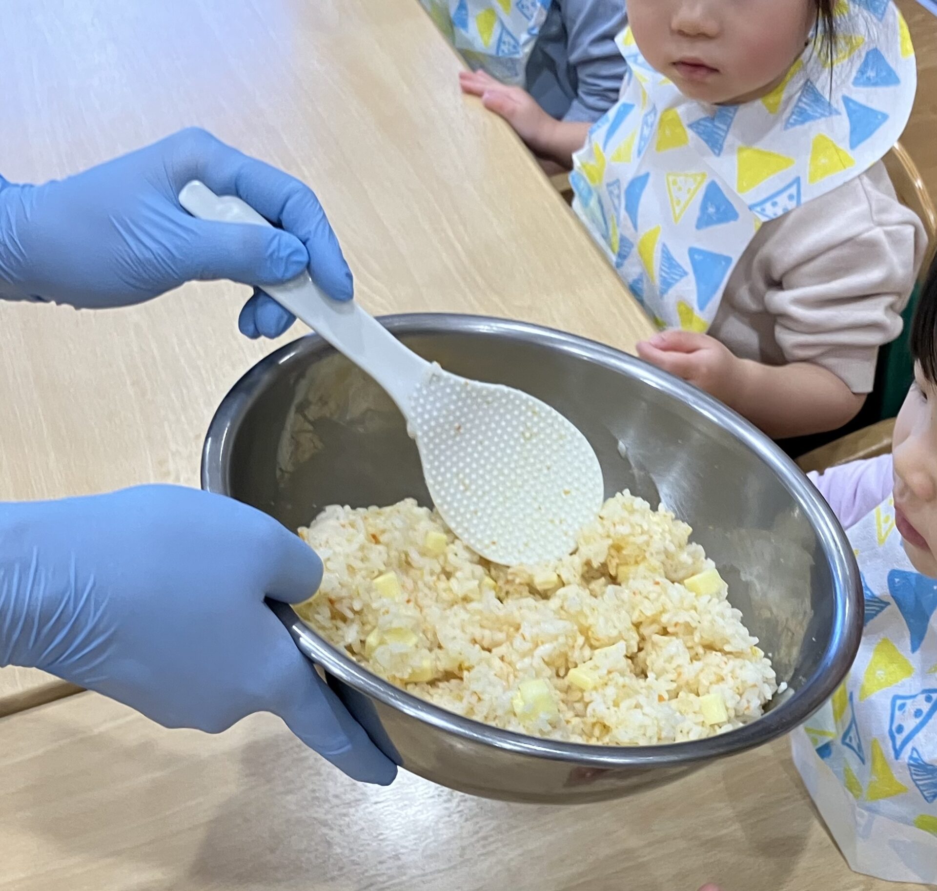 おやつはカレーチーズおにぎり!材料を紹介して子どもたちの目の前で混ぜて握りました。