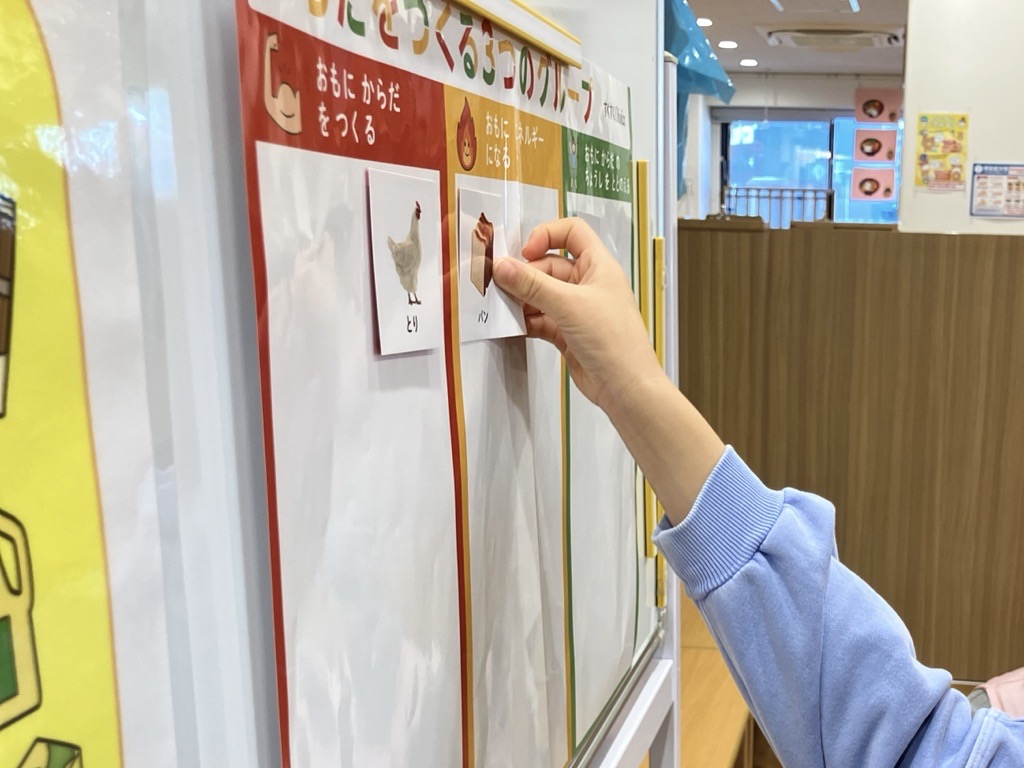 「赤は身体を丈夫にする、黄は強い力をつくる、緑は病気から守ってくれたり、いいうんちが出るお手伝いをするんだよ」と伝えました。それぞれの色にどんな食品があるかみんな興味津々。