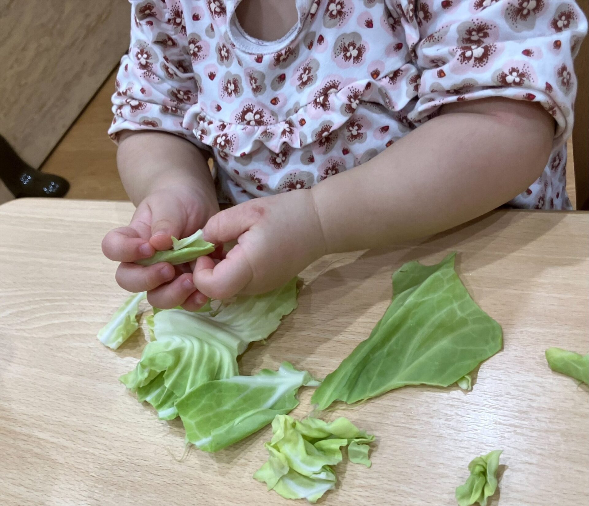 おやつに入っているキャベツとちぎったキャベツを見比べて「きゃ~つ!」と名前も覚えてくれていました!