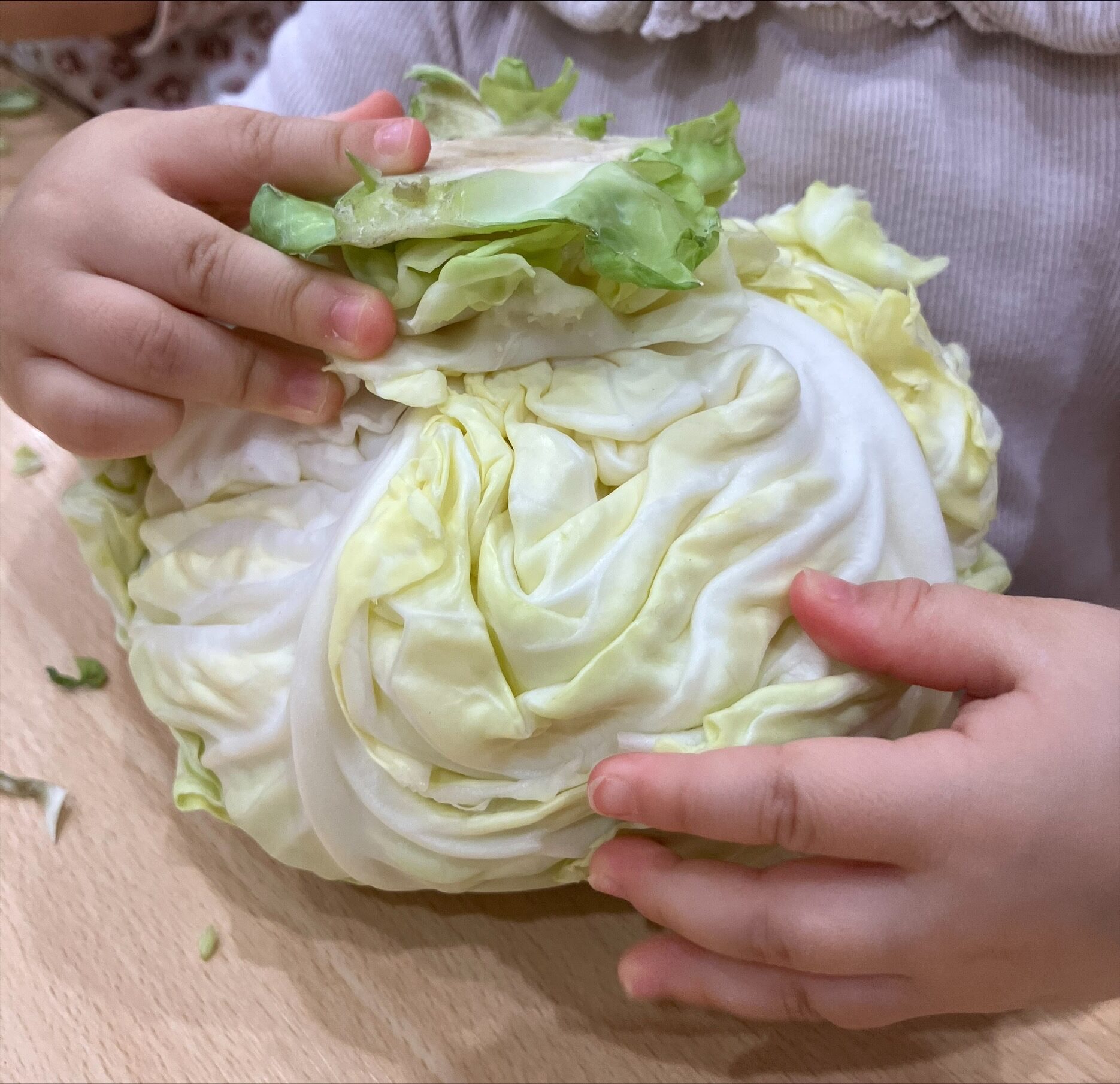 最初は、子どもたちの顔よりも大きなキャベツに、ちょっとドキドキしている様子でしたが、栄養士がキャベツの葉を一枚一枚ちぎって渡すと、触ってみようかな…と手が伸びてきました。