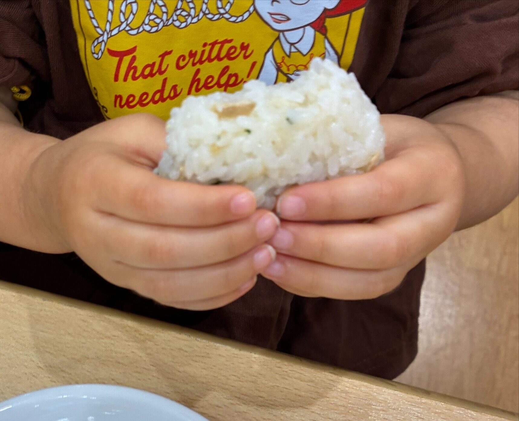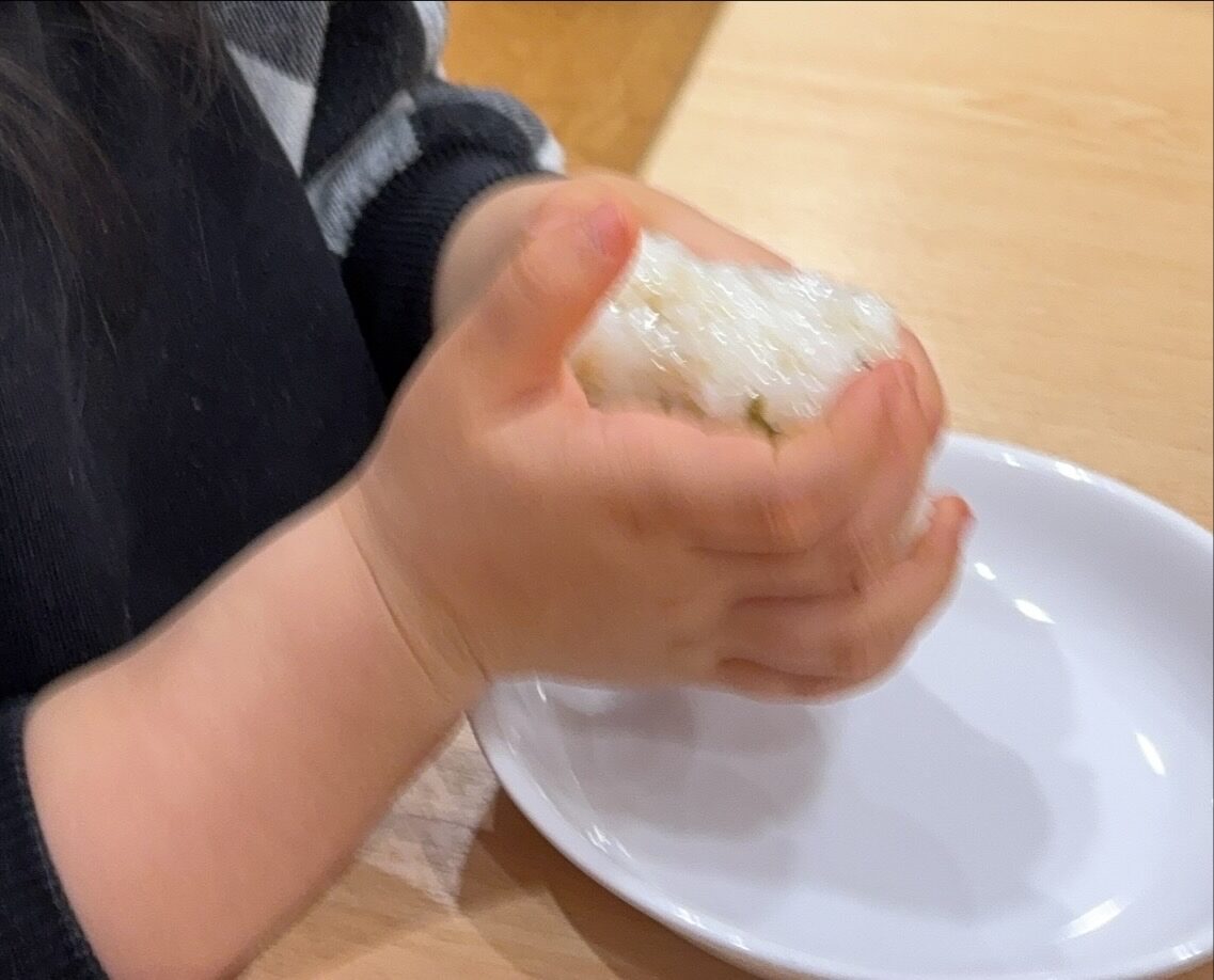自分で握ったおにぎりを大きなお口でぱくり!ニッコニコの笑顔が見られました♪