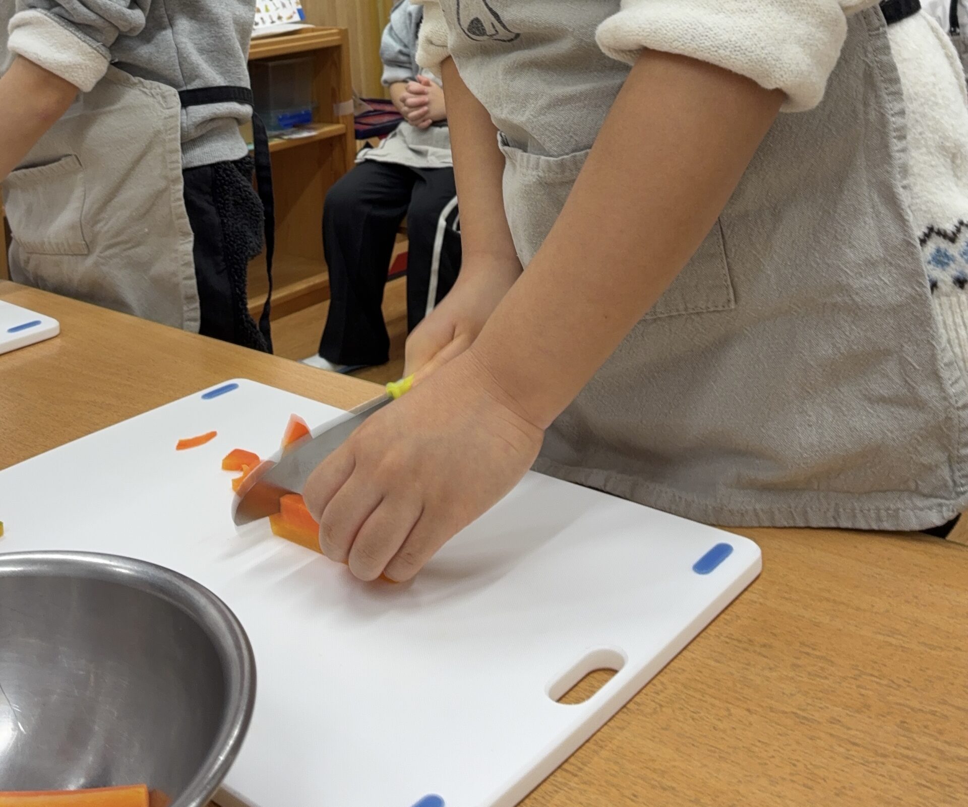 給食の時間、他のクラスに「ぼくたちの切ったにんじんおいしいですか?」と聞いて回り、おいしそうに食べているお友だちの様子を見ることができて嬉しそうでした☻