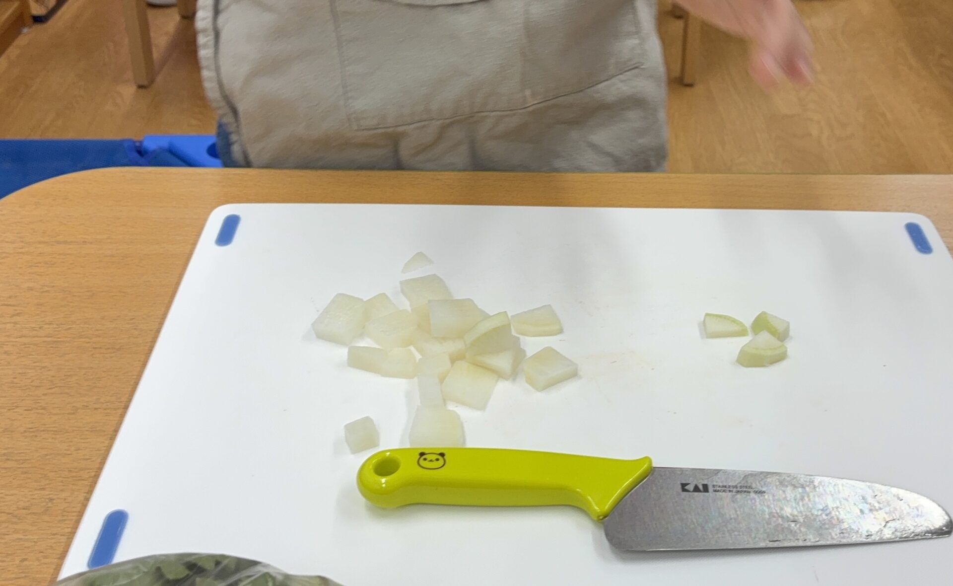 包丁の持ち方と野菜を押さえる手の説明と練習をしてから本番。「猫の手…」「ちょっと大きくなっちゃったなあ」「見て!上手に切れたよ!」と言いながら真剣に取り組んでいました。