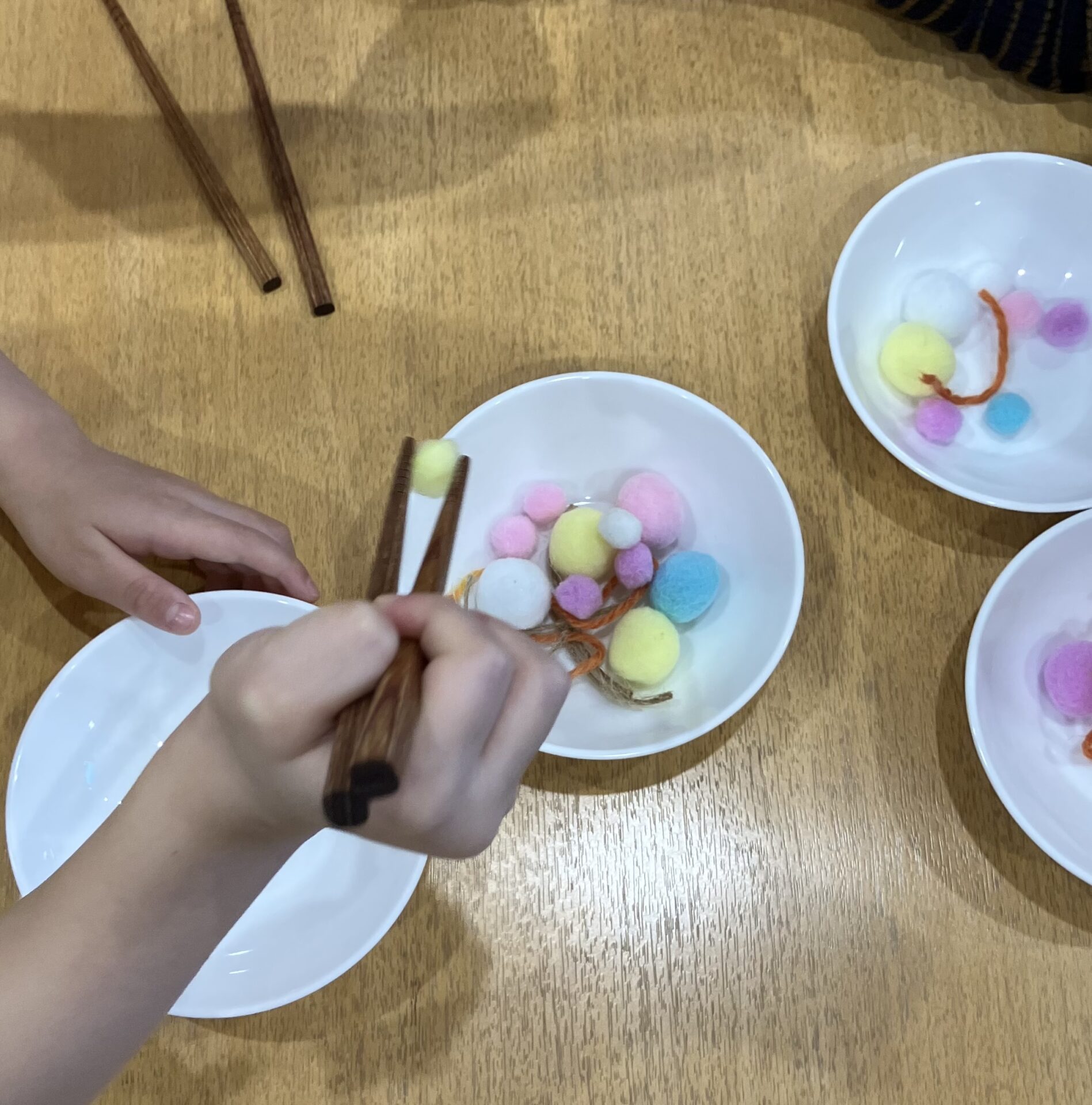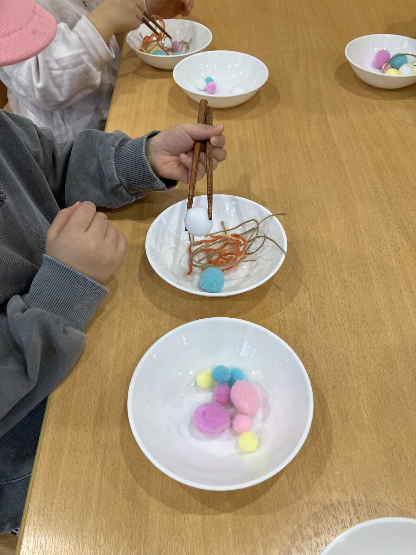 まずは挑戦!…自分なりに箸を動かし、つかむことができて「できたよ!」「先生みて!」と大喜びするこどもたち!みんなの意欲がとても伝わってきたので、毛糸を短く切った素材も用意してみました!