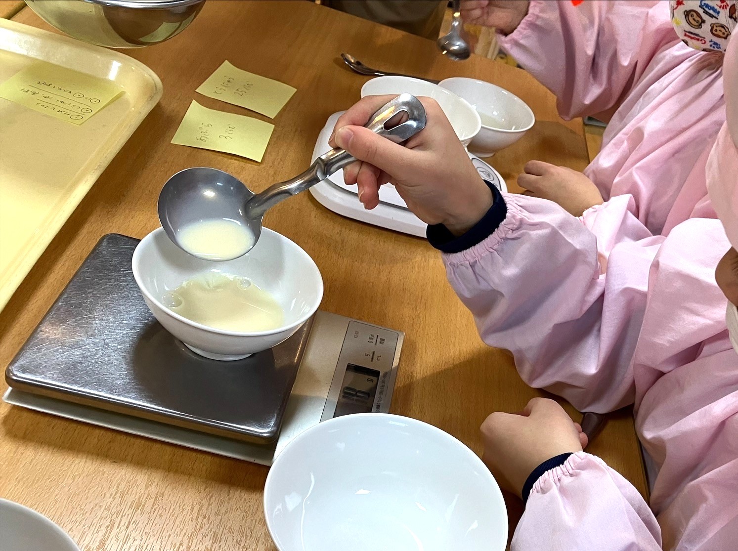 5歳児のお子様たちは昨年の秋ごろより、給食の『ごはん』を自分たちで計りを使用して計量をしています。