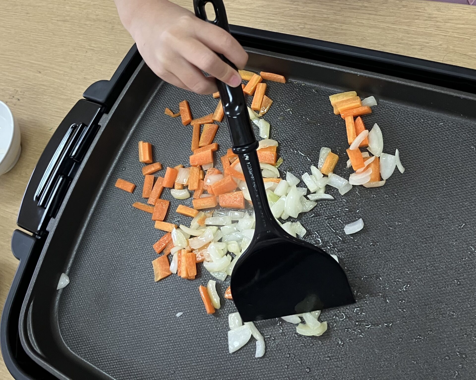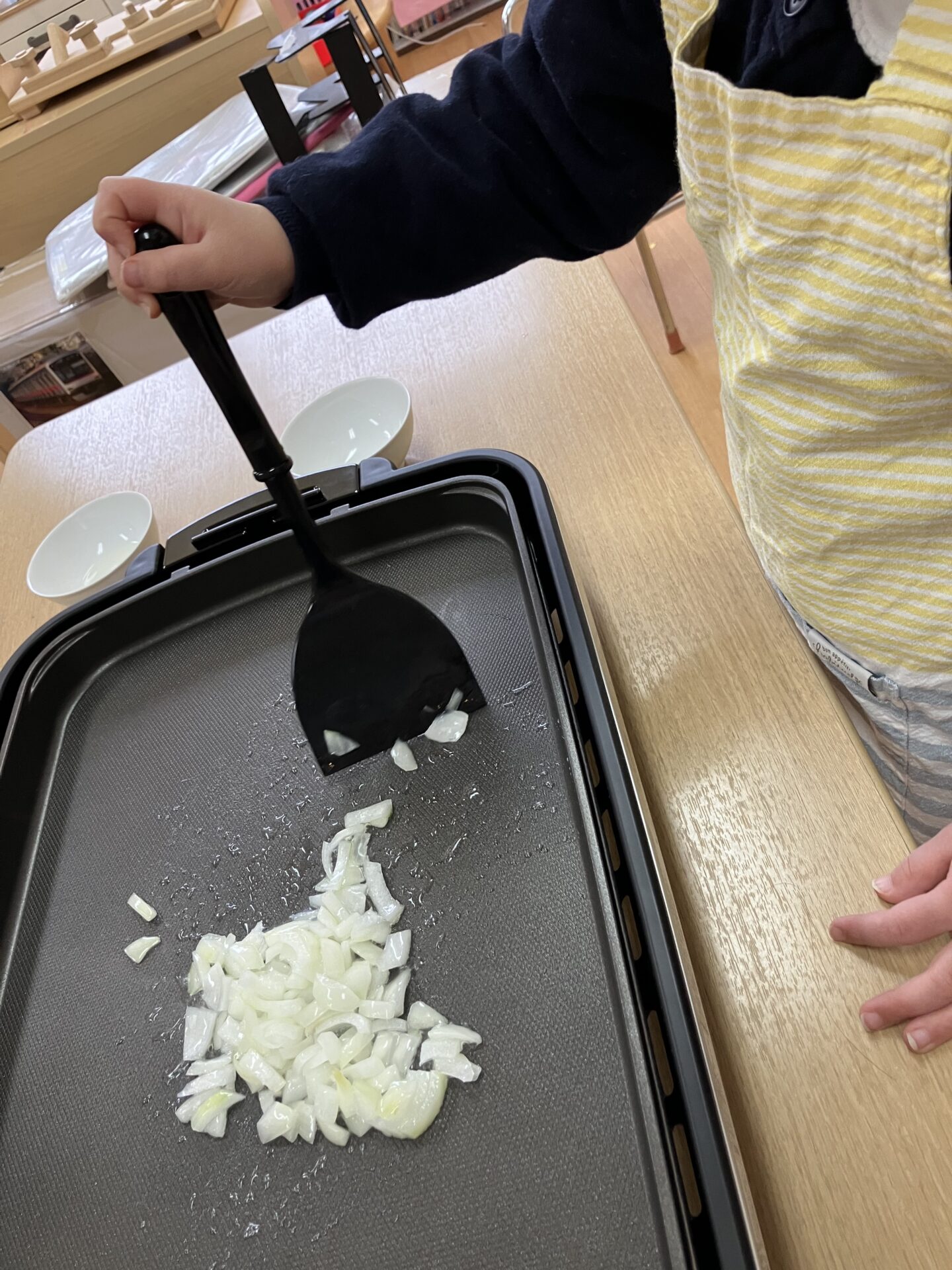 ヘラを二本使って、炒めていきます。「お店屋さんみたい~」「いらっしゃいませ~!」と楽しい雰囲気で取り組んでいました。