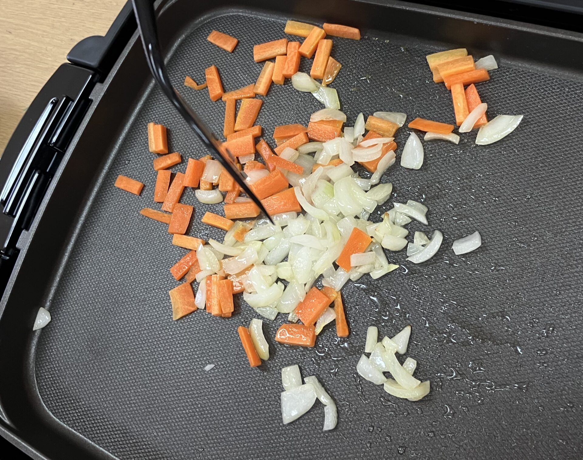 まずはたまねぎから炒めます!ヘラを使って、ジュージュー炒めていきます。