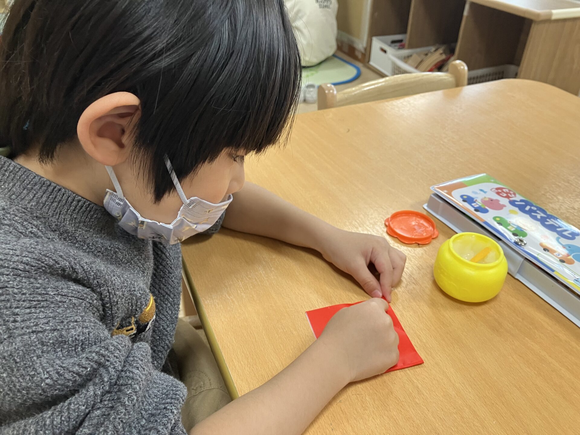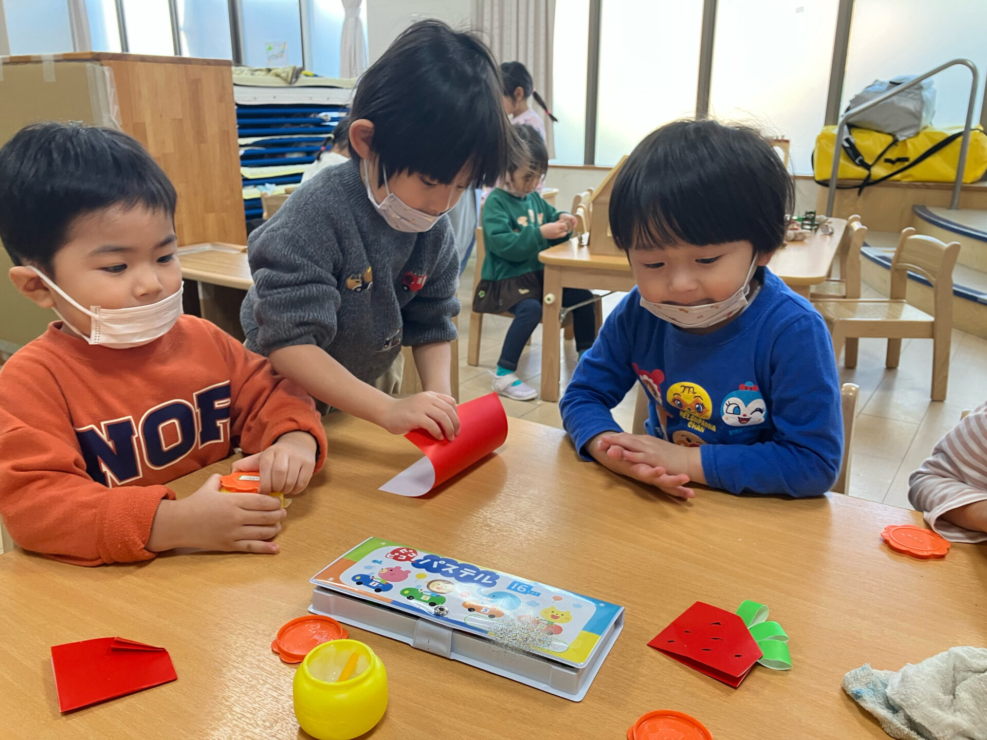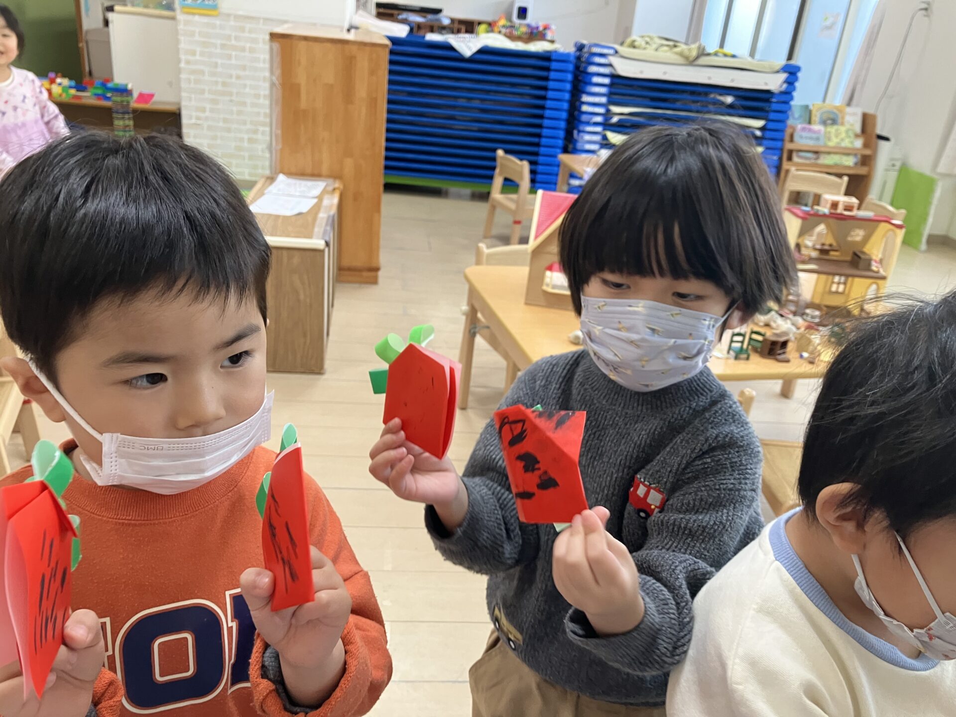 その話からお宝はいちごと決まり保育者と一緒に子どもたちも折り始めました。