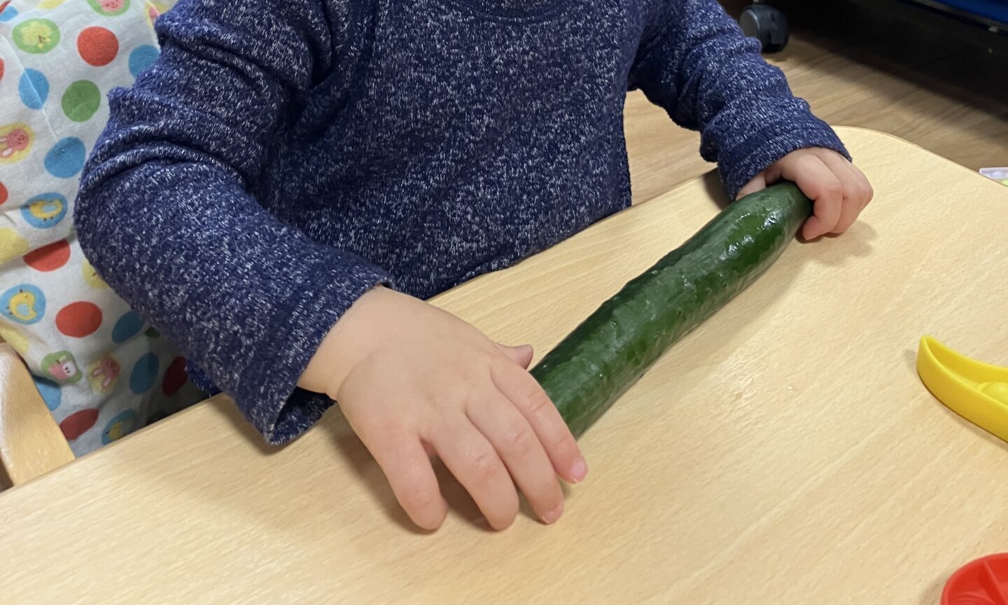 最初は触ることに戸惑っていたひよこ組さんでしたが、慣れるとお気に入りの野菜を見つけ、机の上でコロコロしたり、匂いを嗅いだりと楽しんでいました。