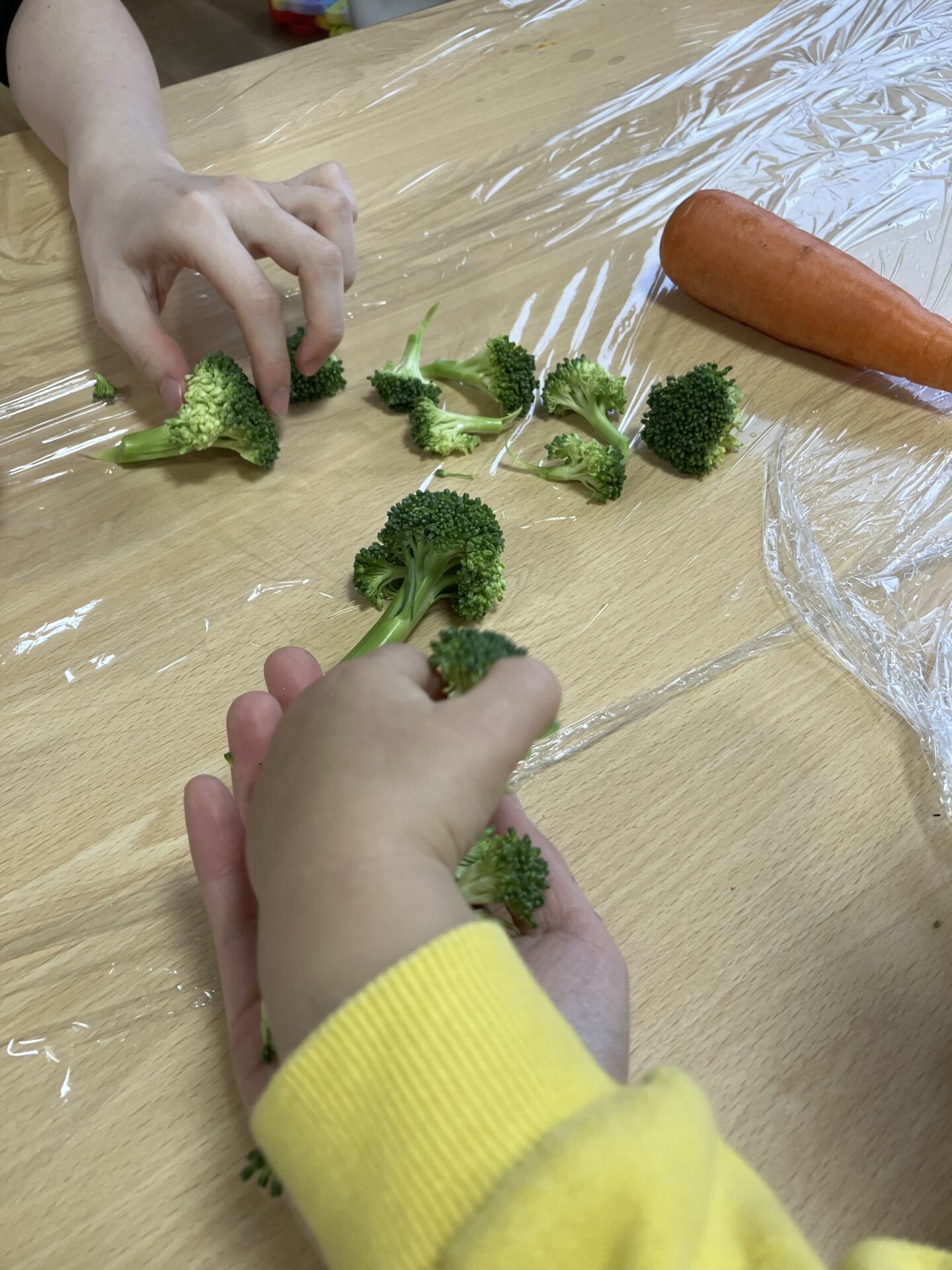 保育者がブロッコリーをちぎってみると、真似をしてちぎる動作も楽しんでいました!