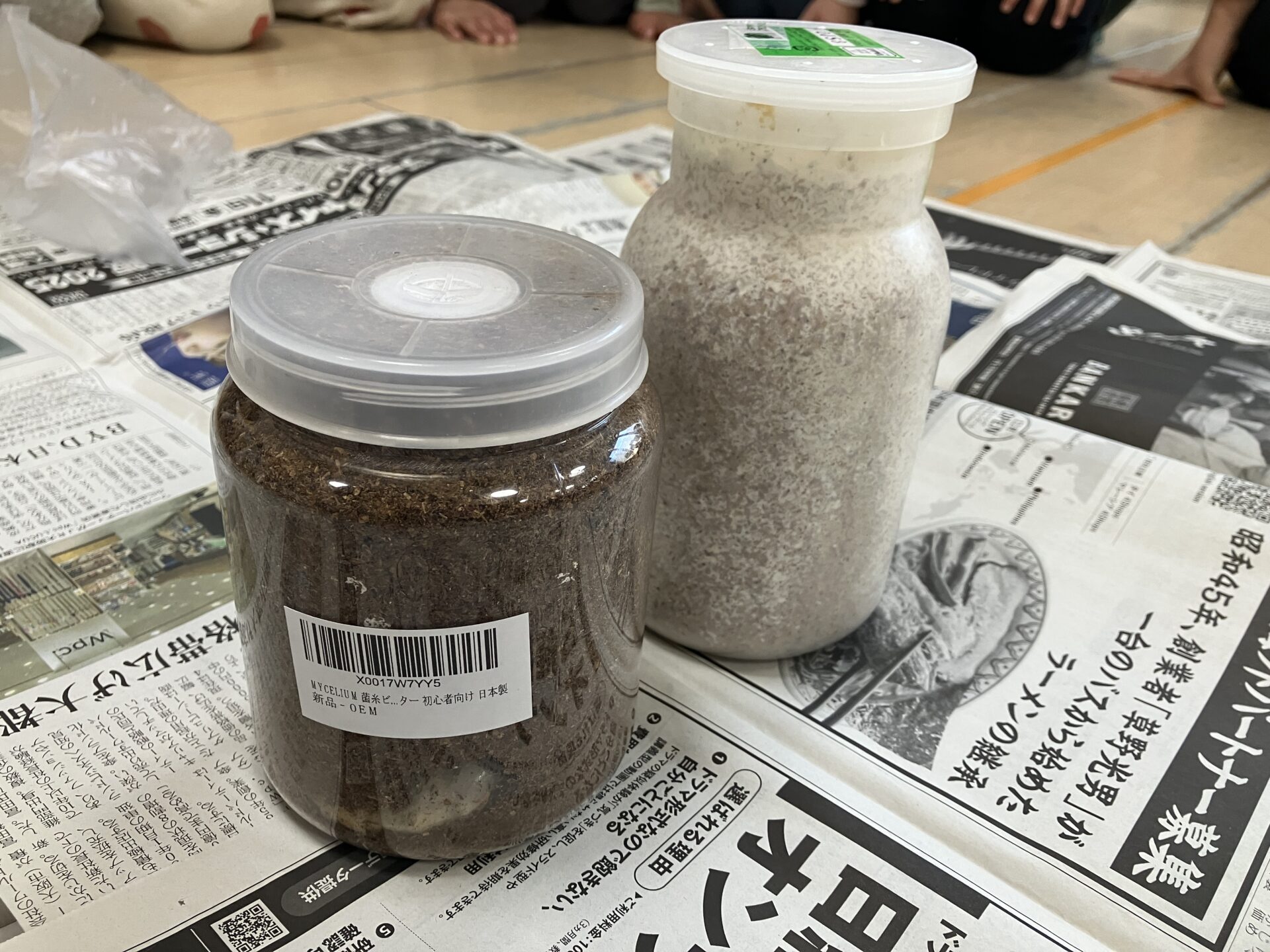 保育者「はじめはこの瓶の中も全部白かったんだけど、幼虫さんが食べて茶色くなったんだよ!」