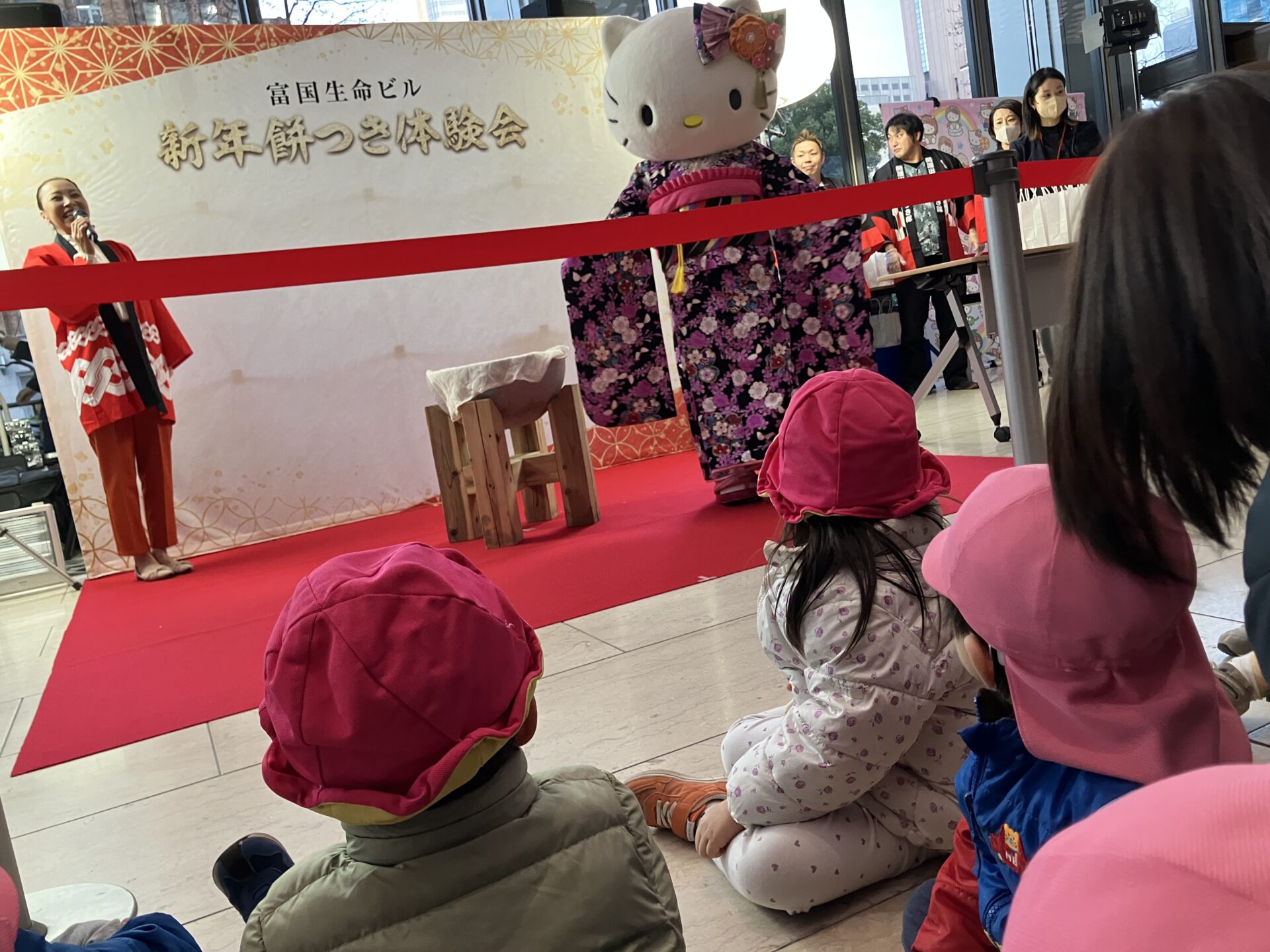 キティちゃんが登場です!今日のキティちゃんはお正月らしくお着物で登場です!子どもたちは大きなキティちゃんに驚き、保育園とは違う会場の雰囲気にもびっくりしてしまい、身動きせずに見ていました。