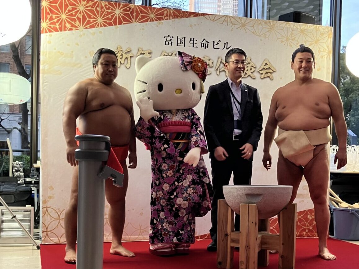 ナーサリー霞が関以外に省庁内に3園の保育園があります。そのうちの一つの保育園の先生から「お餅つき大会があって、お相撲さんとキティちゃんが来るそうですよ!」と情報をいただきました。他の職員とも相談し、もちろん「行きましょう!!」