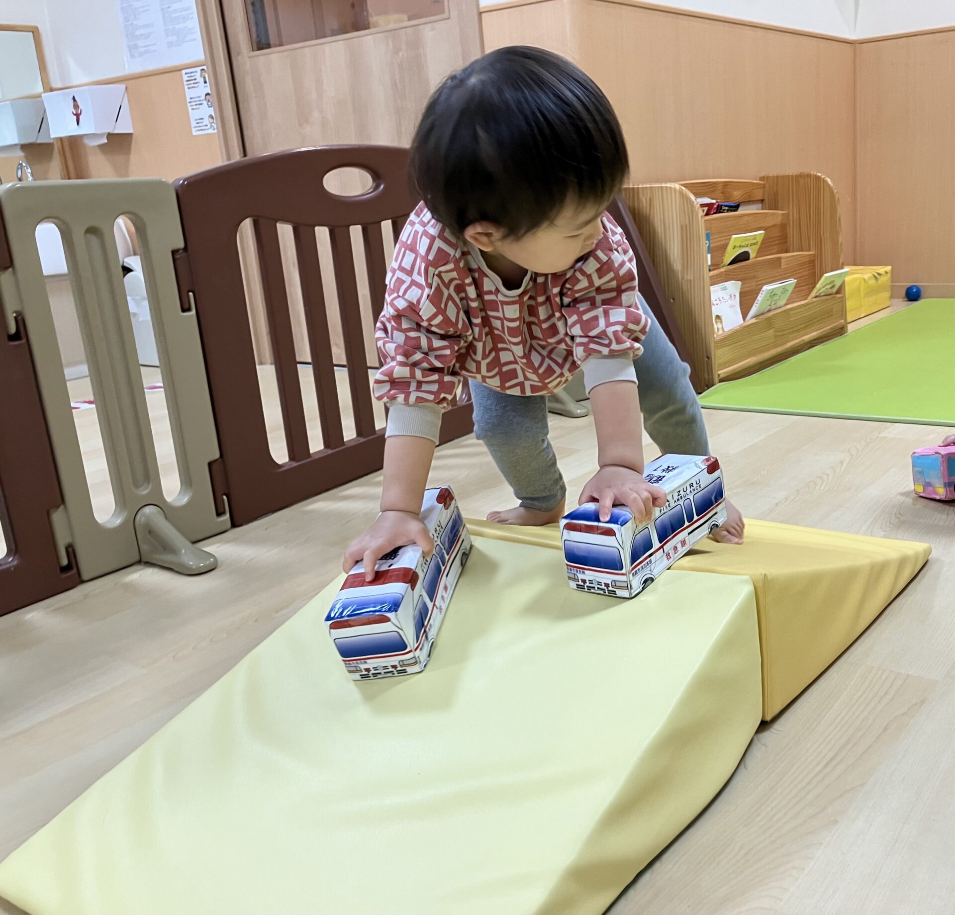 玩具を保育室の端から端まで走らせて遊んでいます。