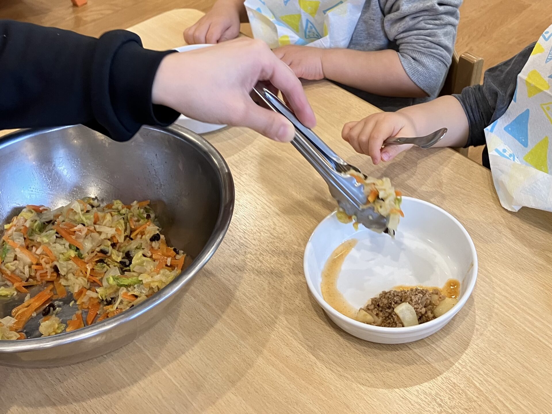 こあら組の子どもたちの目の前で“白菜のフレンチサラダ”を作りました!