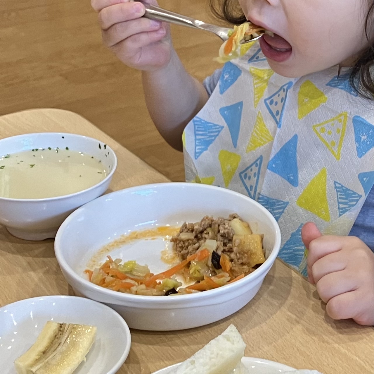 もりもりと元気よく食べてくれるうさぎ組さん。今回は、進級に向けて簡単な食事マナーを習得しました。