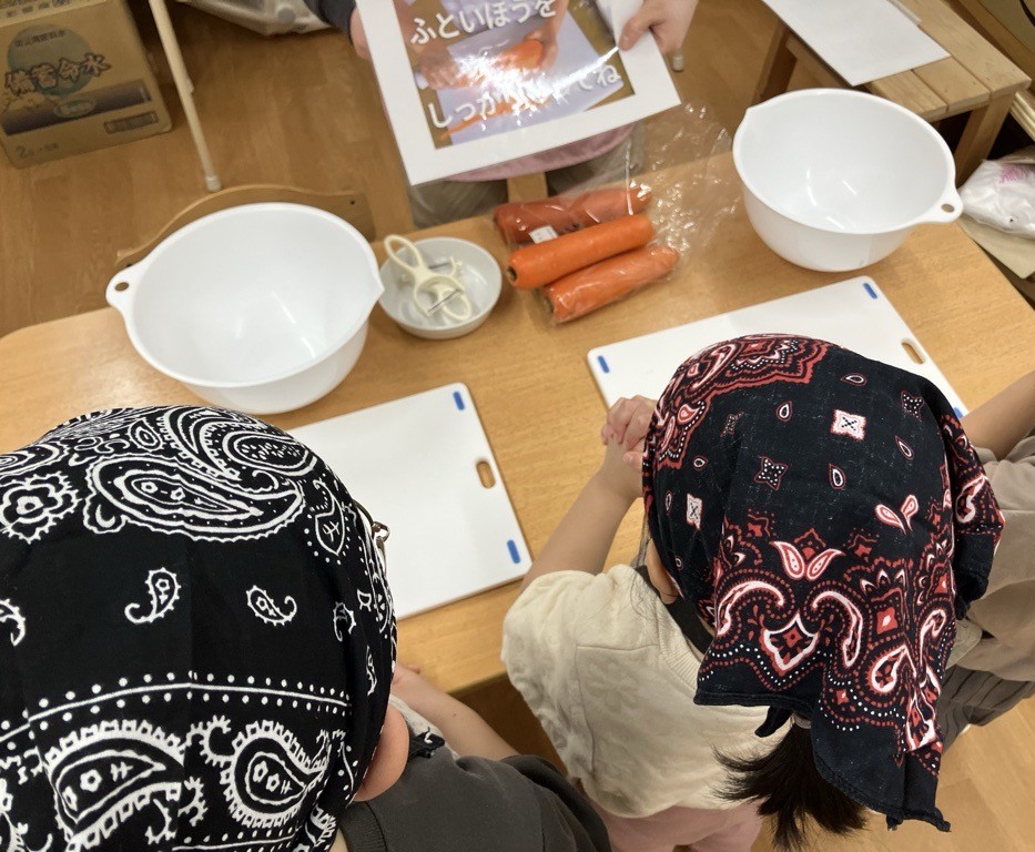 来月もきりん組さんにピーラーを使った皮むきをしてもらうので、その時のために「またお家でも練習してみてね」と伝えました。次回も楽しみですね♪