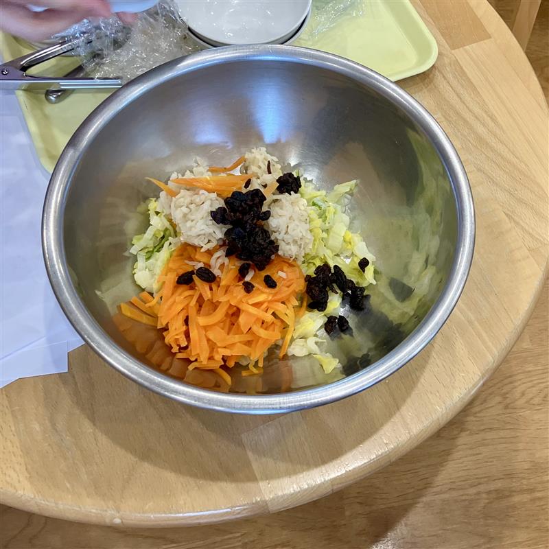 はくさい・にんじん・切干大根・レーズンをそれぞれ紹介してボウルに入れ、酢・油・砂糖・塩を合わせたドレッシングを和えると…完成✩