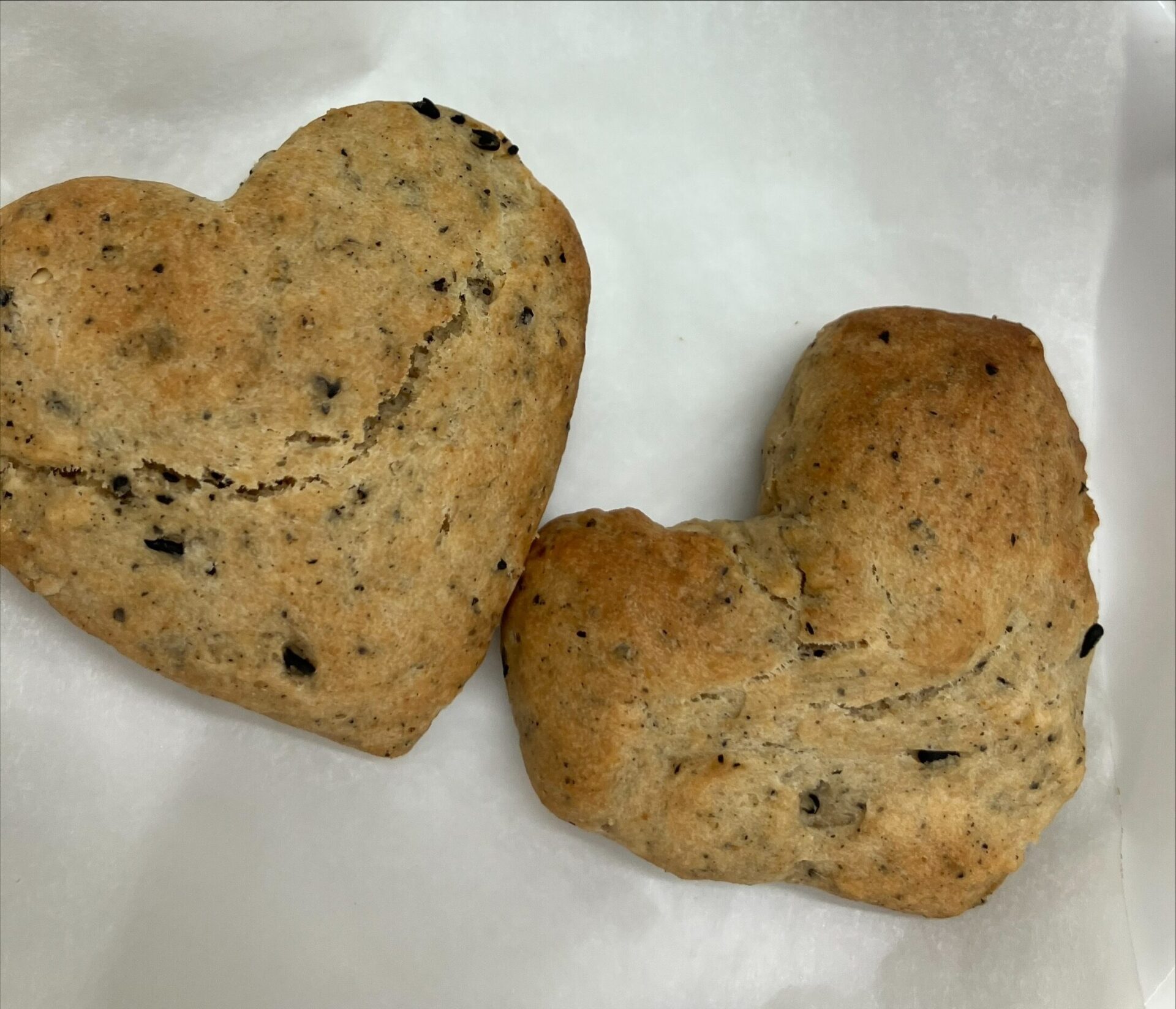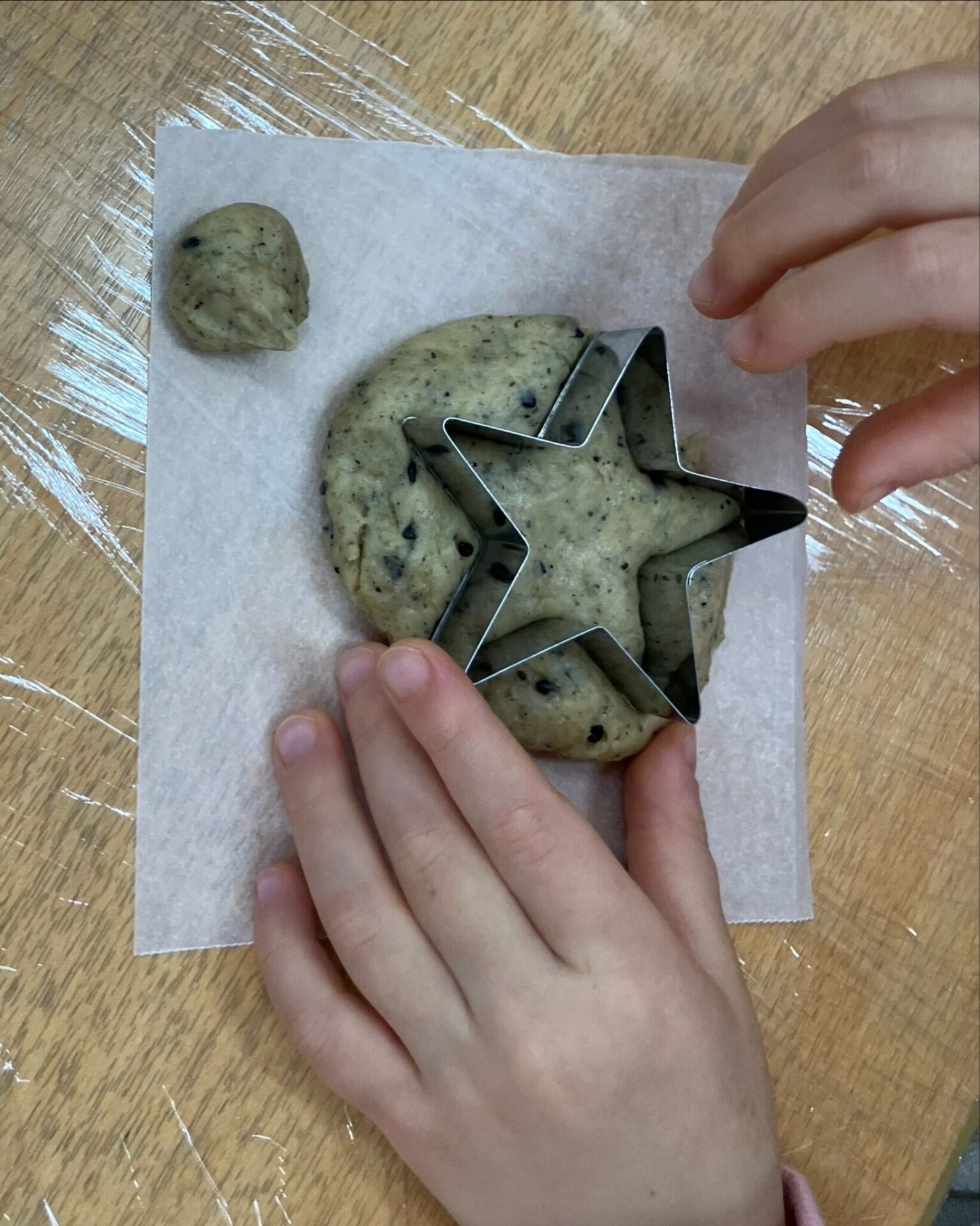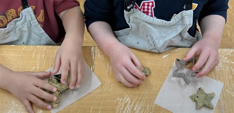 生地を伸ばしてハート型か星型を選んで1つくり抜きます。「周りの生地は好きな形にしていいよ!」と伝えると、「見て!これヘビみたい!ヘビクッキーにしよう!」「ハートの型抜きにしたけどもう一つ手でハート作ってみる!」など想像力を働かせる姿が!