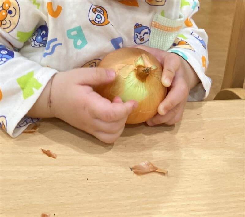 まあるい形にとんがり帽子。とんがり帽子をつんつん♪玉ねぎの皮むきは意外と力を使います。保育者がむきやすく手伝った皮の端をつまみ「んんん~!!」と声にならない声で力いっぱい引っ張ります。